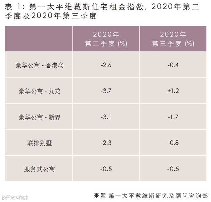 我们预计2020年第四季将面临更多挑战。这不单是豪宅租市的传统淡季,而且由于经济环境严峻,抵港人数可能会少于往年。通常豪宅租金与中环甲级写字楼租金走势相似,而中环甲厦租金开年至今已下跌10.8%,空置率从2020年初的4.0%攀升至近6.0%。许多本地及跨国公司依赖在政府援助,而未来六个月可能会出现裁员潮,这将对本港住宅市场需求产生明显负面影响。