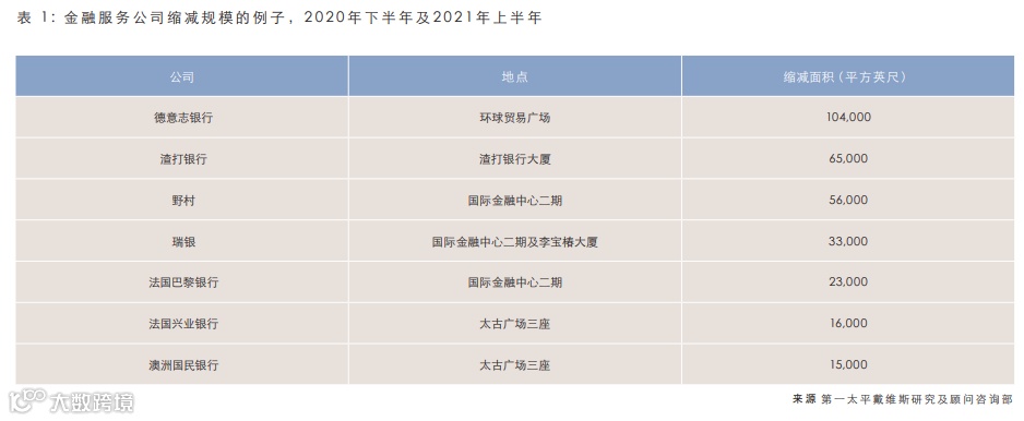 多间金融机构正采用弹性上班惯例作为更恒常的上班方式,并普遍在租约到期时缩减规模。假如使用办公桌轮用制,银行预料将缩减20%空间,后勤部门将受到最大影响。跨国企业似乎更坚决地採用更灵活的业务模式,而香港公司则偏向维持较传统的方式,亚洲各地区均呈现这种趋势。