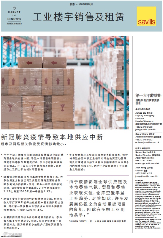 随着供应链出现混乱及本地零售销售额下跌,多数第三方物流公司及货运代理商的业务额急剧减少。因此,部分公司已选择缩减规模,这导致仓库空置率由2019年第四季度的2.2%大幅上升至2020年第一季度的2.9%。
