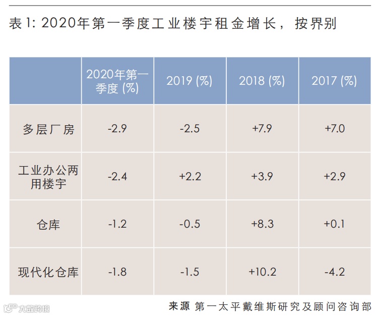 尽管不少业主洽谈租约时保持灵活立场,但大多数并不打算从年初开始即应租户要求提供租金优惠。因此,2020年第一季度整体及现代化仓库租金降幅皆比预期温和,分别为1.2%及1.8%。