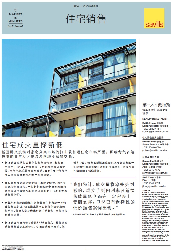 第一太平戴维斯发布第一季住宅销售研究报告指新冠肺炎疫情打击本港整体住宅市场气氛,超级豪宅成交于1月及2月创新低,3月则因疫情短暂受控、市场气氛改善而出现反弹,直到3月中旬海外港人涌回香港而引发新一波感染潮。