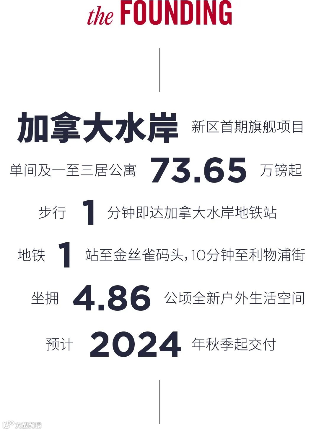 The Founding将是加拿大水岸新区最早完工的住宅楼,交付时将已有各类社区配套设施逐步投入使用,其中就有大楼入口对面全长170米的全新步道,出门步行1分钟,就能直达加拿大水岸交通枢纽。