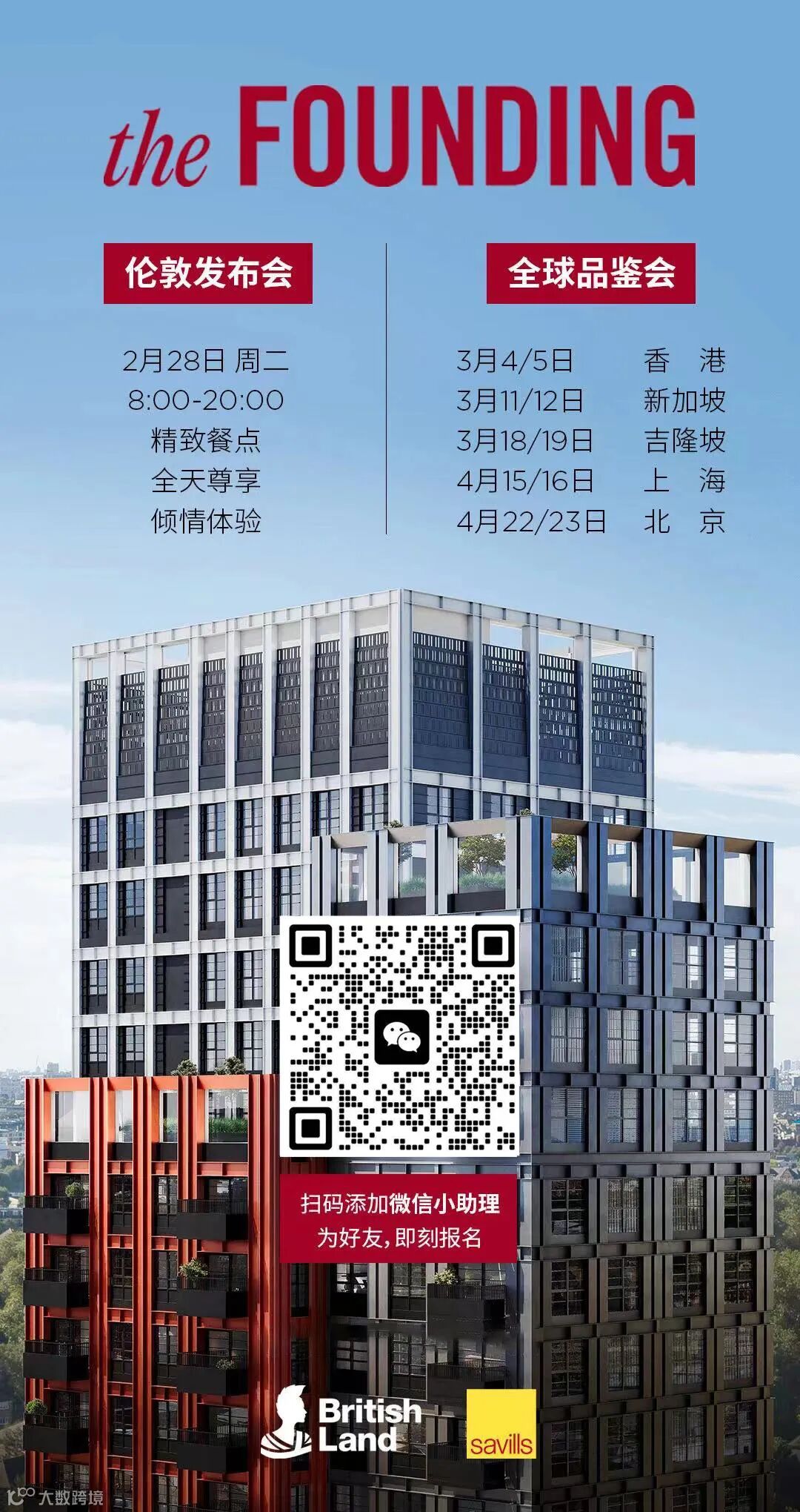 The Founding将为一栋35层建筑,通过双向视野设计,将伦敦天际线「搬进」楼内公寓中。如果您无法参与上述活动,也可以扫码联系小助理,预约样板间一对一看房,精准咨询项目信息。