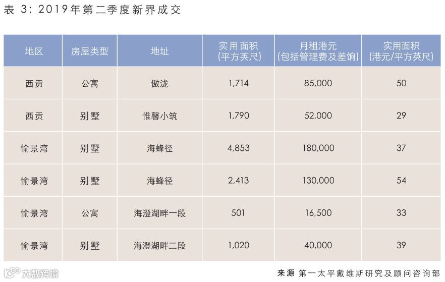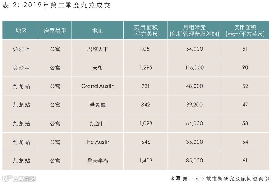 “第二季度,月租超过10万港元的单位租市淡静,惟内地及本地人士对月租7至10万港元单位的需求较为殷切,推动成交。比如尖沙咀Victoria Dockside的K11 ARTUS 5月有一个1,284呎的两房单位以月租14.5万港元成交,合呎租113港元,刷新九龙住宅呎租纪录。”