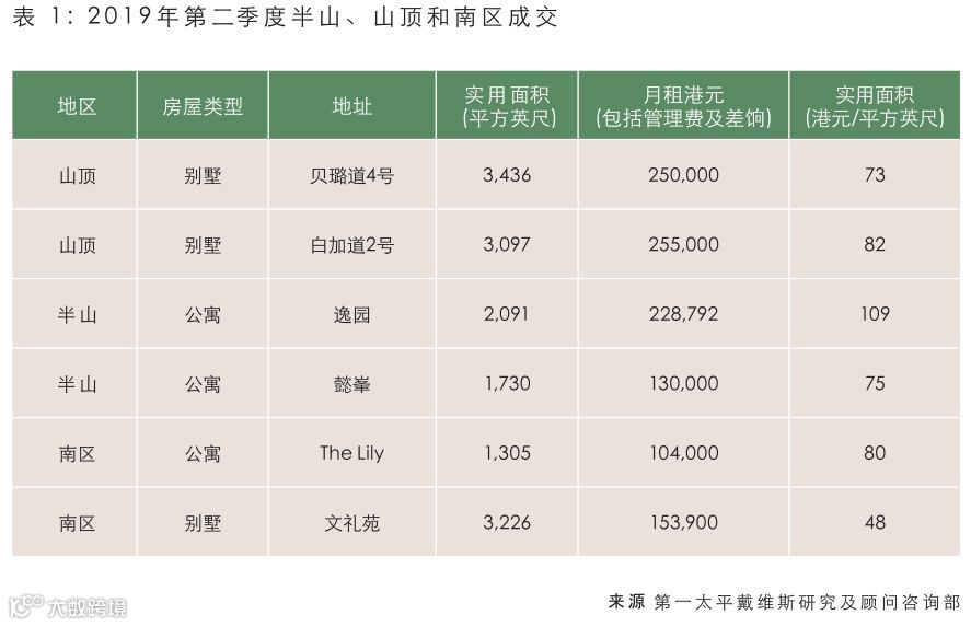 第一太平戴维斯发布住宅租赁报告指因金融服务需求减弱,本港豪宅租赁市场于第二季度走势疲弱,各区租金均略有下降。联排别墅租金因供应有限而保持坚挺,仅录得小幅调整。外籍人士在豪宅租赁市场中影响力持续下降,市场现由本地及内地租客主导。