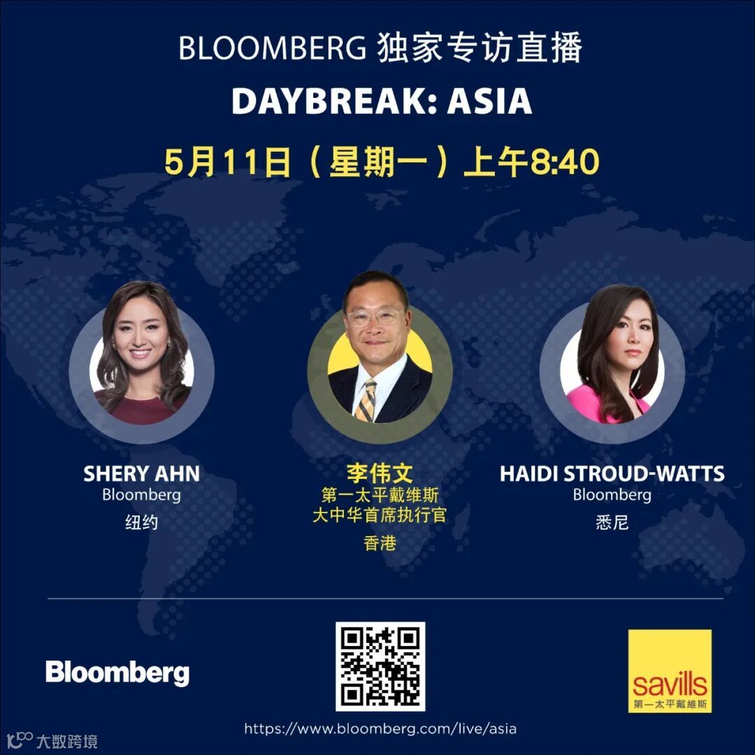 5月11日(星期一)上午8:40,第一太平戴维斯大中华首席执行官李伟文先生将于香港接受Bloomberg独家专访,电话连线澳大利亚悉尼的Haidi Stroud-Watts及美国纽约的Shery Ahn两位主播,探讨全球地产风云。