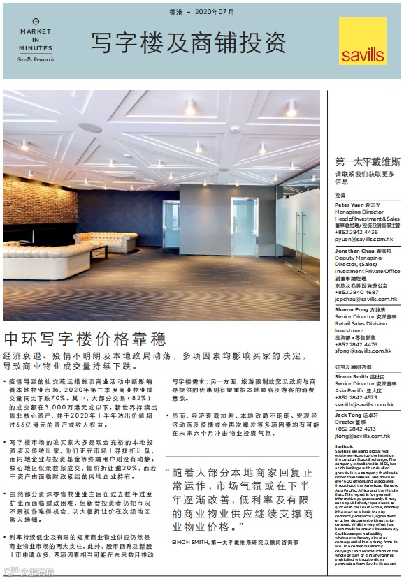 “随着大部分本地商家回复正常运作,市场气氛或在下半年逐渐改善,低利率及有限的商业物业供应继续支支撑商业物业价格。”