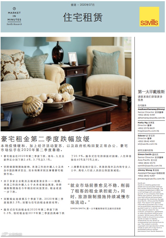 第一太平戴维斯发布第二季度住宅租赁报告指,由于封关政策限制内地及海外人士入境, 以及入境者抵港后需隔离14日,本地需求已成为豪宅租赁市场的主要驱动力。此外,由于本港营商环境转差,裁员潮出现。好在由于政府部门已恢复工作,得以照常签发工作签证;新来港人士多来自美国及欧洲,主要从事金融和IT行业。