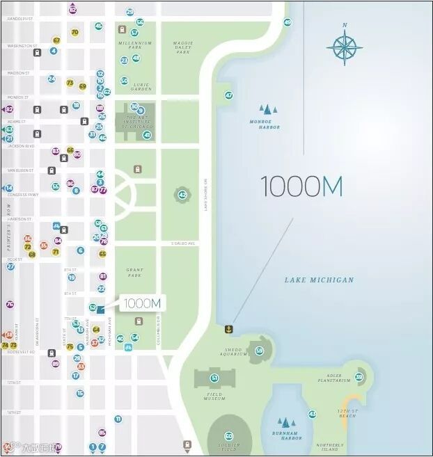 1000M西边则是格兰特公园和密歇根湖,密歇根湖是北美地区五大湖泊之一,面积居第三位,同时也是唯一一个全部属于美国的湖泊,在1000M,居民将拥有永不被遮挡一望无尽的绝美天际。