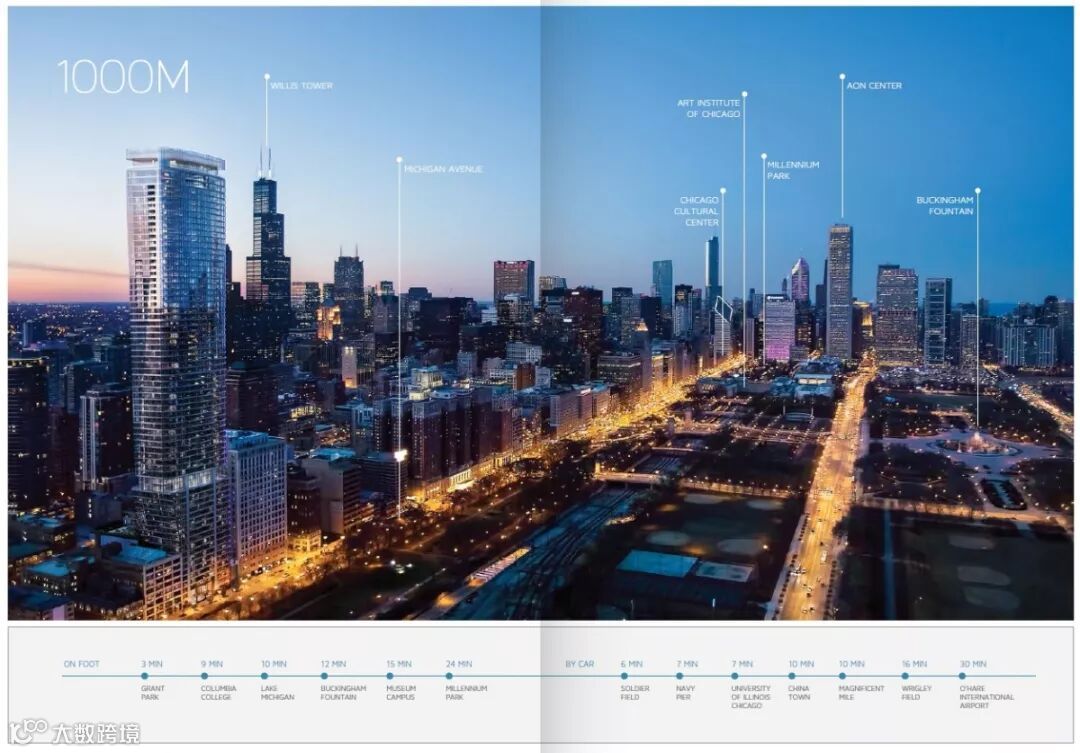 此地遍布着名品商店、高档酒店和著名的建筑物,是市区里最为繁华的一段商业街道。南密歇根大道则为“文化一英里”,周边遍布有传奇的博物馆、剧院、画廊等,我们的标志性项目1000M就位于这一聚集了奢华和文化的中心大道之上。