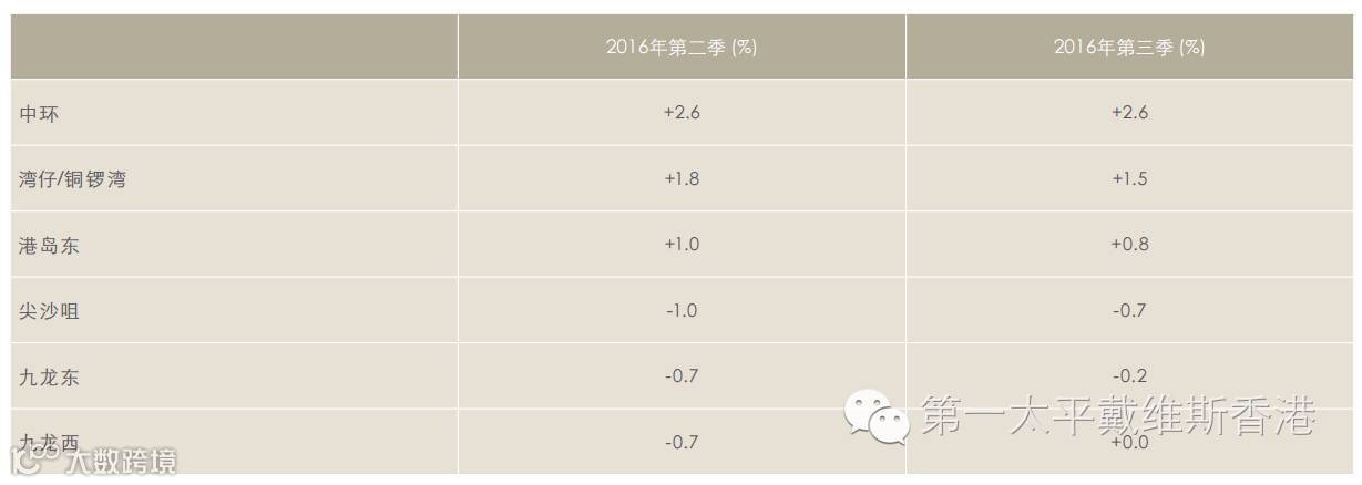 甲级写字楼租金增长,按地区(2016年第二季及2016年第三季)