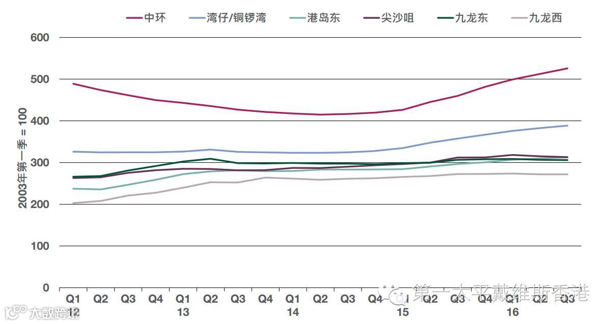 2012年第一季度–2016年第三季度甲级写字楼租金指数,按地区