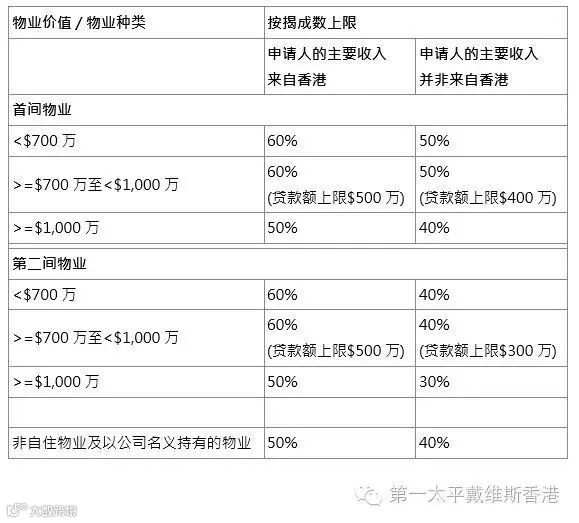 在申请按揭程序中,银行会先替物业进行估价,并与物业成交价比较,取较低者计算可造按揭金额。此外,是否首间物业、是否自住及申请入的主要收入是否来自香港也会影响按揭成数。下表为撰文时的所得资料,只供参考,按揭成数以银行审批为准,因此购买物业前,应向银行查询。