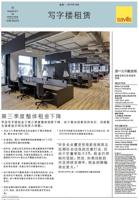 “诸多企业受到中美贸易紧张局势及近期社会动荡双重打击,但甲厦总体空置率低于5%,租金仍然相对坚挺。如果目前的情况持续到明年,则租金将出现更大幅下跌。鉴于中环要待2023年方有甲厦新增供应,一定程度上将支持该地区租金企稳。”