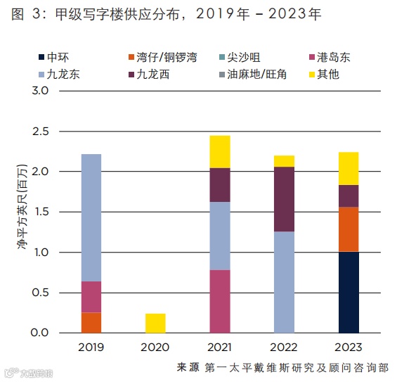 第一太平戴维斯发布第三季度写字楼租赁报告指香港甲级写字楼租金终结连续七个季度增势,季内总体租金下降1.0%,空置率处于3.8%低位。除西九龙地区租金与上季持平,其余地区录得不同程度的跌幅。从积极角度来看,虽然一些跨国企业考虑搬迁至亚太其他地区,中资公司仍选择留在香港。未来五年,新增供应将集中在九龙东及非核心区,而中环将于2023年迎来大量新甲厦落成。
