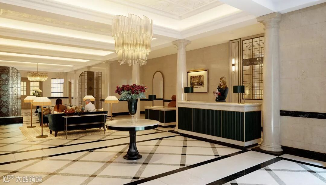 项目入口大堂瑰丽堂皇,偌大的服务台,别具气派,其灵感来自Art Deco时期的几何图形艺术和低调奢华风貌。