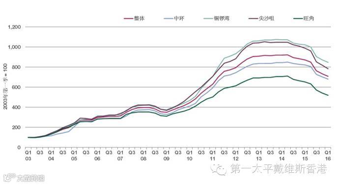 2003年第一季至2016年第一季按地区甲级写字楼价格指数