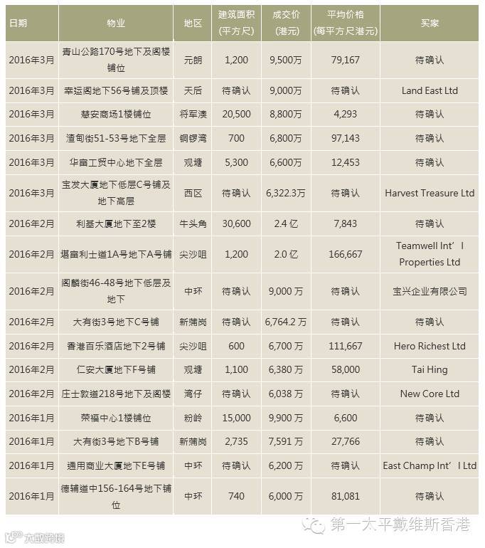 2016年第一季大额零售交易(6,000万港元以上)