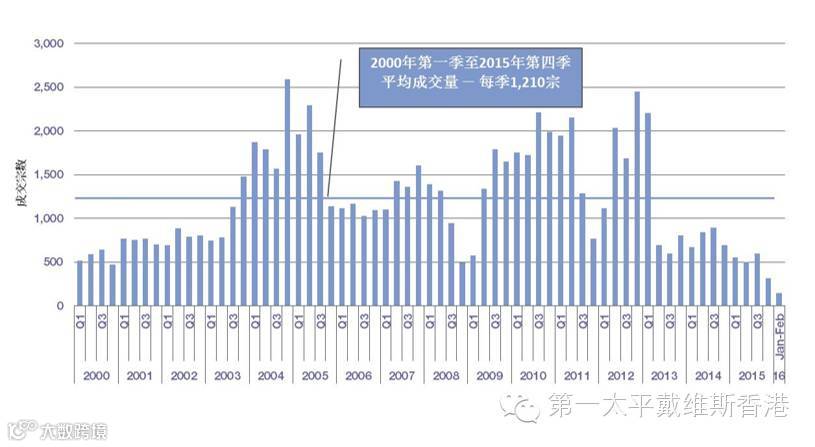 2000年第一季至2016年第一季写字楼成交宗数