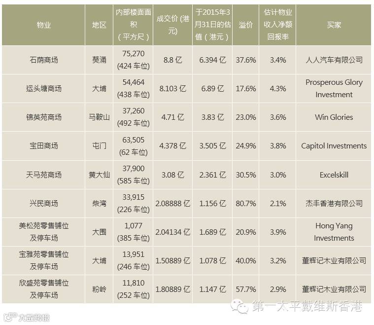 2016年领展房地产基金近期出售的九幢零售物业