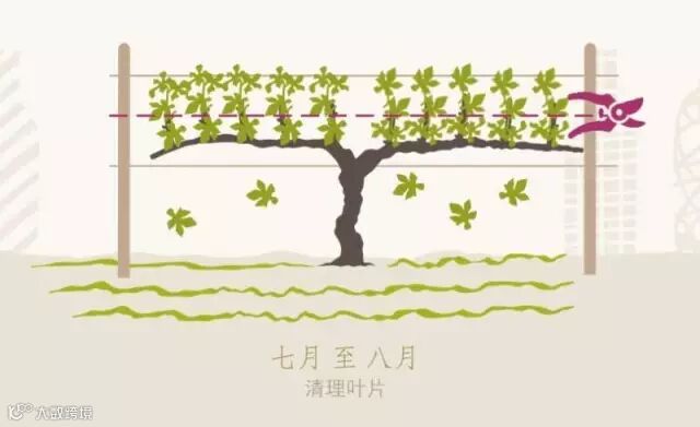 烈日炎炎的仲夏,葡萄树开始坐果。为了保证果实的质量,葡萄需要充足的光照以积累色素和风味物质,才能顺利转色,达到较好的成熟度。因此,酿酒师需要清理葡萄树的叶片,这也是夏季修剪的重要环节。没有过多叶片的遮挡,每一粒葡萄才能充分享受阳光的沐浴,茁壮成长。