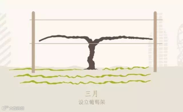 葡萄树在经历漫漫寒冬后苏醒,新的枝条从冬季修剪时留下的切口处抽出,开始了新一轮的生命周期。这一阶段,酿酒师为葡萄树搭起支架,引导他们的生长方向。葡萄园内的支架在设立后通常不会拆除,酿酒师需要做的是,修补那些因为机械或气候灾害损坏的部分,更换破损的金属丝并系紧松动的金属丝。葡萄架完善后,酿酒师将葡萄藤固定在最低的金属丝上。
