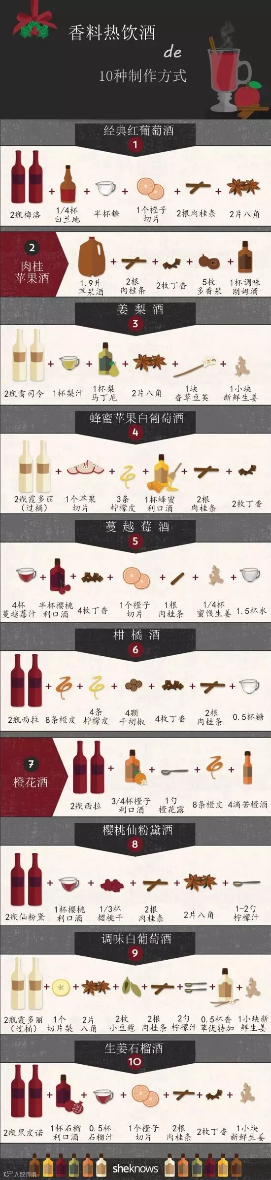 梅洛(Merlot)、雷司令(Riesling)、霞多丽(Chardonnay)、西拉(Syrah)、仙粉黛(Zinfandel)、黑皮诺(Pinot Noir)等葡萄酒以及朗姆酒(Rum)、伏特加(Vodka)等烈酒加入生姜、肉桂、橙皮等调味料都能变成美味易饮的香料热饮酒。用来制作香料热饮酒的葡萄酒不需要太贵,普通的超市酒也可以。下图是10种不同香料热饮酒的配方,赶紧学习学习吧!