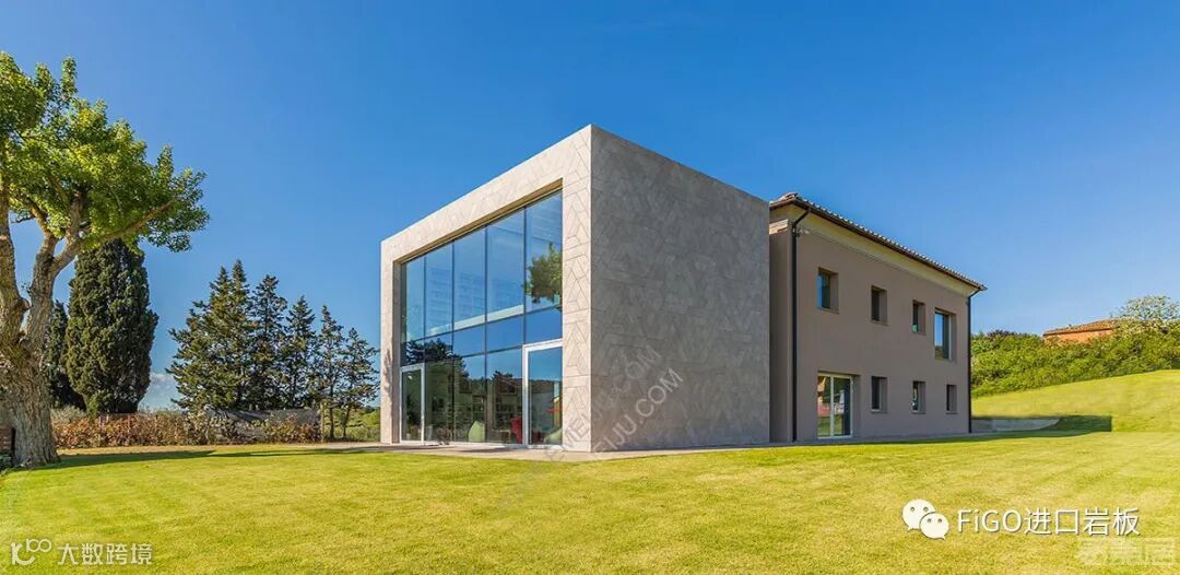 由于项目坐落于乡郊,甲方及设计单位都希望这次的翻新及重建能满足零能耗的能源政策方针。最终设计师选中了Porcelaingres Urban Great Sand岩板作为扩建区域的幕墙物料。Urban Great Sand沙土色如混凝土的设计完美融入四周的大自然景观当中。而岩板特大的尺寸及丰富的可加工性经过设计师量身裁剪成几何形状后,正好沿袭了已故的设计师Adolf Loos对高辨识度设计的追求,让整个建筑极具个性与生命力。