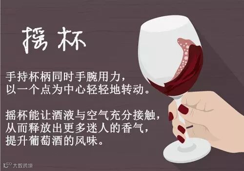 一般,葡萄酒刚倒入杯中,很有可能还处于沉睡的状态。因此,你需要通过摇杯,使葡萄酒充分接触氧气,然后唤醒其风味。这对于佳酿而言,更是如此。初学者可以把酒杯放在平滑的桌子上,再抓住酒柄轻轻摇晃酒杯慢慢练习。