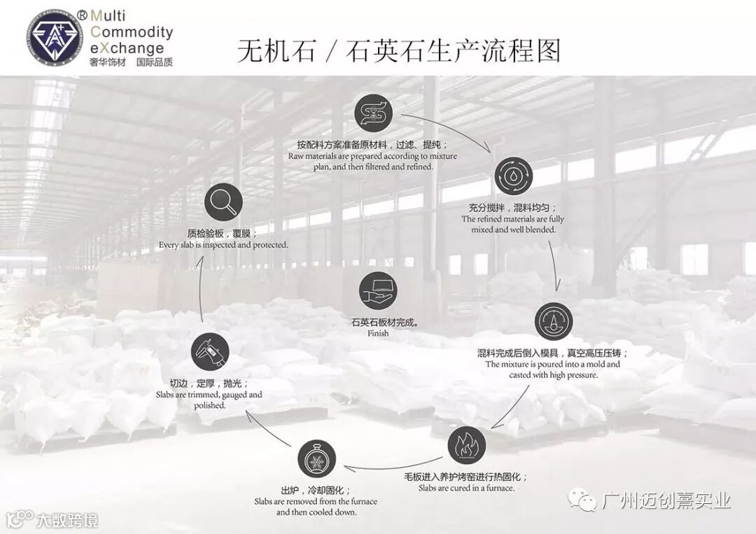迈创熹实业联合同业将充分发挥矿山资源,石英砂加工及板材生产全产业链优势,工厂占地面积90亩,厂房面积40,000平方米,研发中心面积1,200平方米,采用先进的设备和完善的配套,装备十六台国内最先进从电脑配料,搅拌,自动布料及全自动化压机和夹板式固化炉组成的生产线,六组全自动化意大利及国内最先进磨光生产线,配套意大利simec及台湾桥切机,台湾白动磨边机和意大利加工中心组成的台面板加工系统,一套全意大利simec自动化标准板墙地砖生产线。年产量一百五十万平方米高品质石英石板材、台面板、墙地砖。