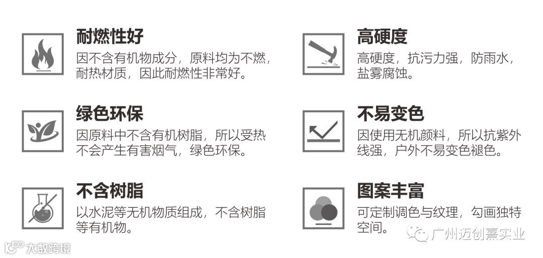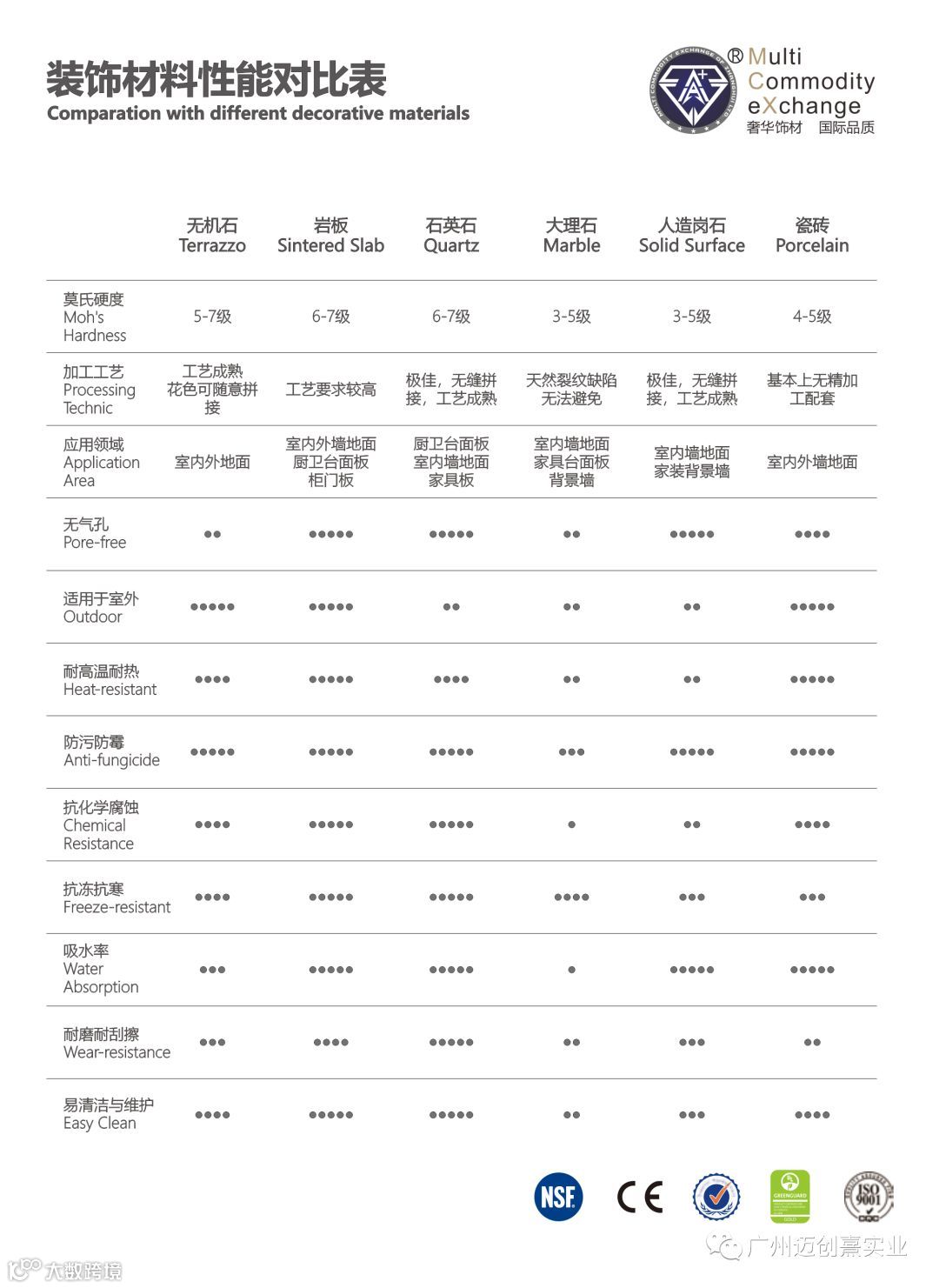 迈创熹实业无机石含有天然石英质类原材料可达60%以上,采用环保型无机粘接剂、无机颜料,不含树脂胶水等有机成分,通过高频高压震动压制成型。骨料含量更高、产品莫氏硬度更可达6-7级,耐磨耐刮花,效果保持更加长久。不含树脂等有机成分,原材料均为不燃、耐燃材质,产品达国际A级耐火标准,且高温下不易变形,不产生有害烟气,安全环保。