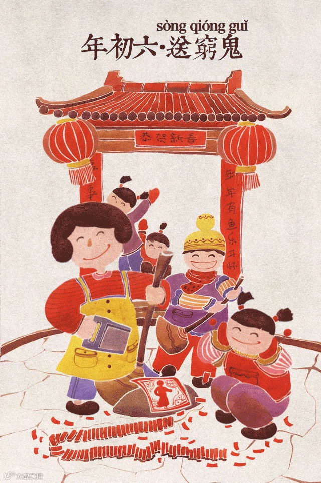 老北京民俗谓:这一天,家中主妇要把节日积存的垃圾扔出去,谓之送穷鬼,门上的挂笺也可摘下来同时扔出去,叫做送穷神。这一天最受欢迎的是当年满12岁的男孩,12是6的二倍,可称六六顺。又传说福神刘海是北京人,是个穿红披绿的胖小子,民间流传着“刘海戏金蟾,步步钓金钱”的俗语,其形象很受市民欢迎。正值本命年的男孩,以刘海打扮,背着5个用白纸或彩纸剪成的小人上街,谁抢到就算谁抢到了财神,被抢者叫扔掉穷鬼。如果两位都是本命年者相遇,谁先抢到对方背后的小人谁吉利。也有用布制小包当穷鬼向外扔的,双方背后均要背个小筐,先把小包投入对方背后筐中者为先扔穷鬼,吉利。