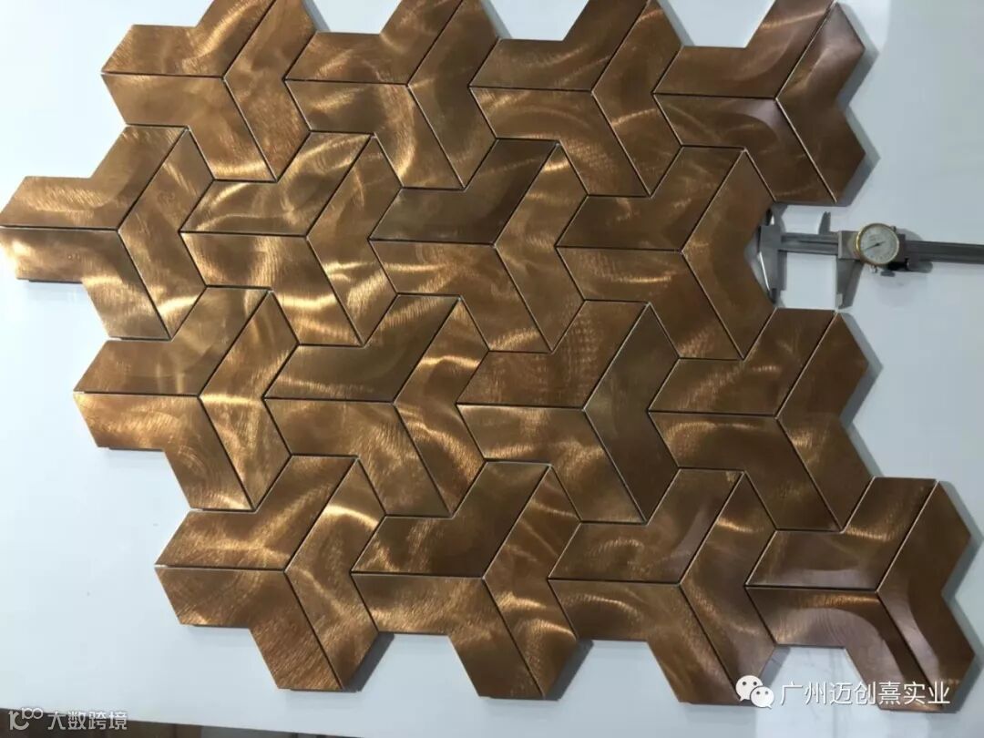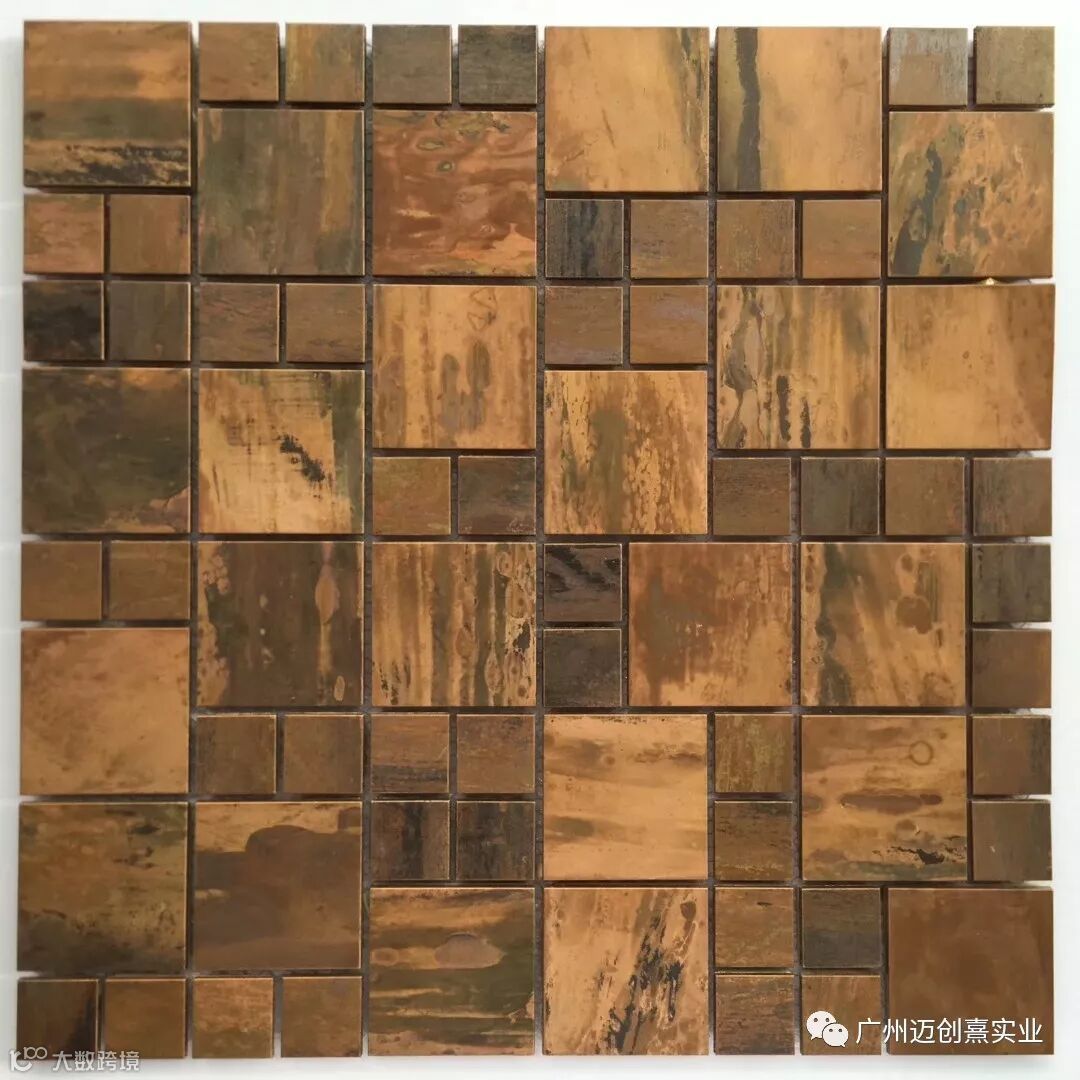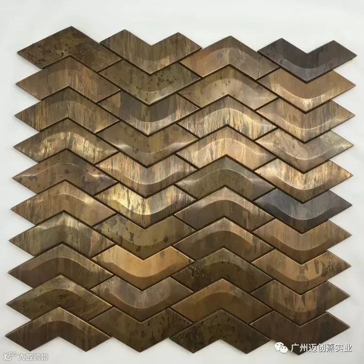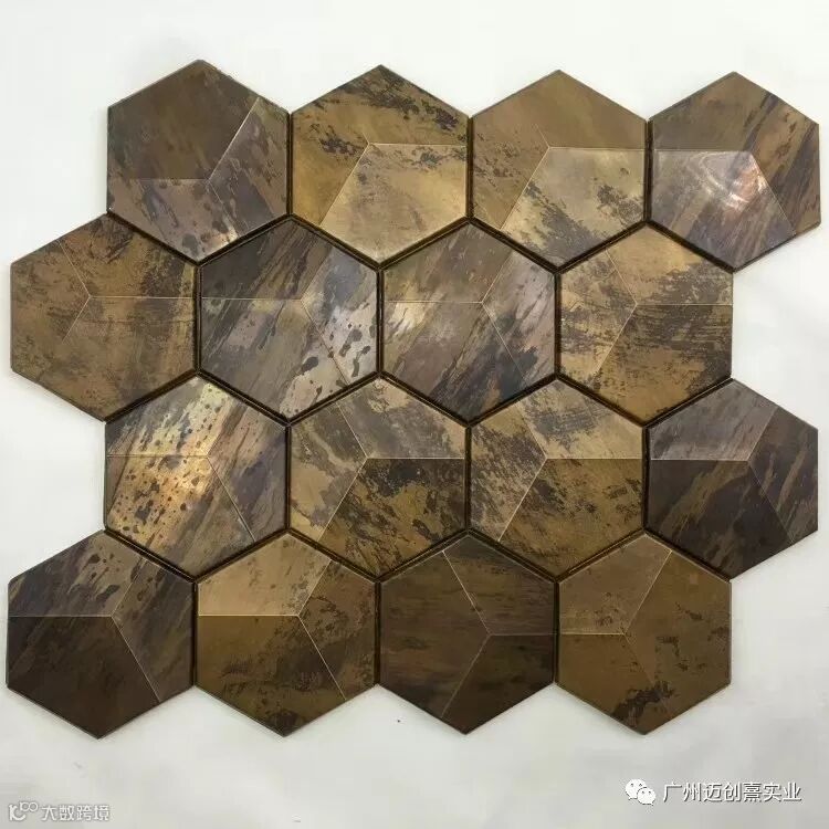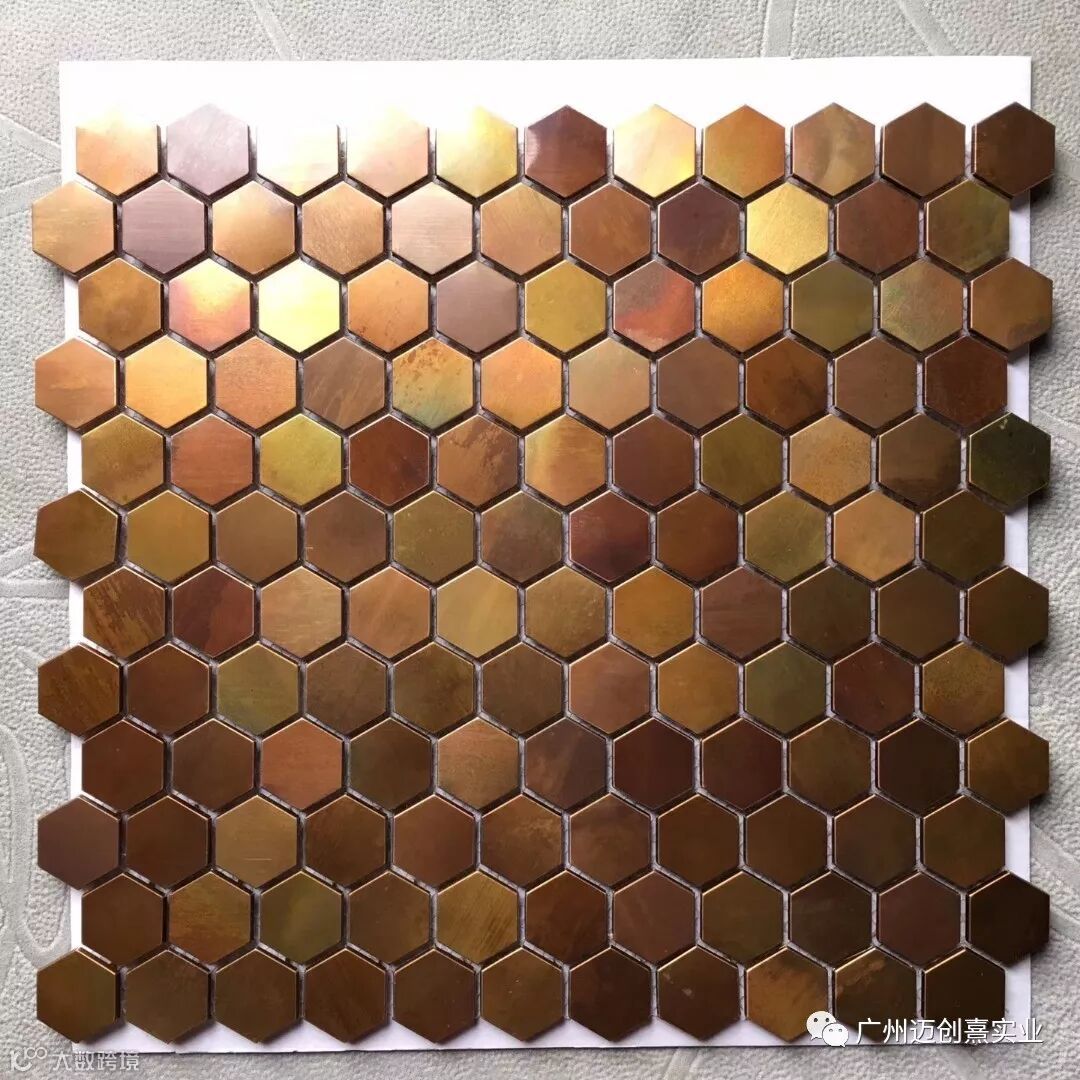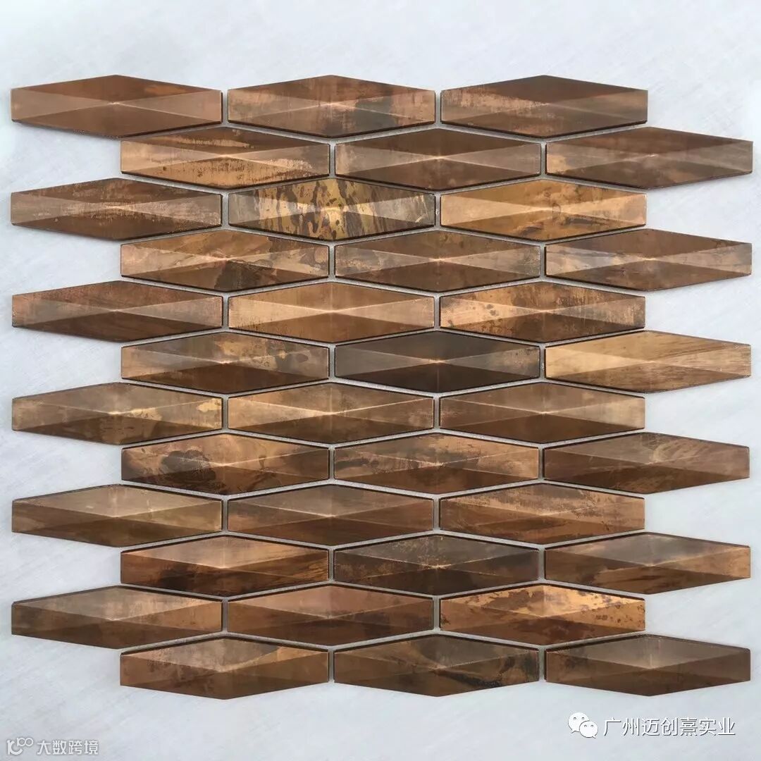 迈创熹实业重金属(铜或不锈钢)马赛克和砖片是指把冲压而成的一定厚度和形状的金属片,通过特殊的粘合剂覆合在全瓷砖片基体上,产品的基体是全瓷砖的特性- 高强度易施工, 而展现出的产品则是完全现代工业质感的腐蚀或抛光(铜或不锈钢)表面.