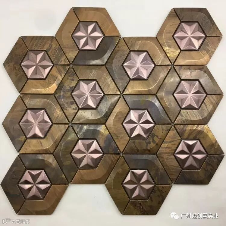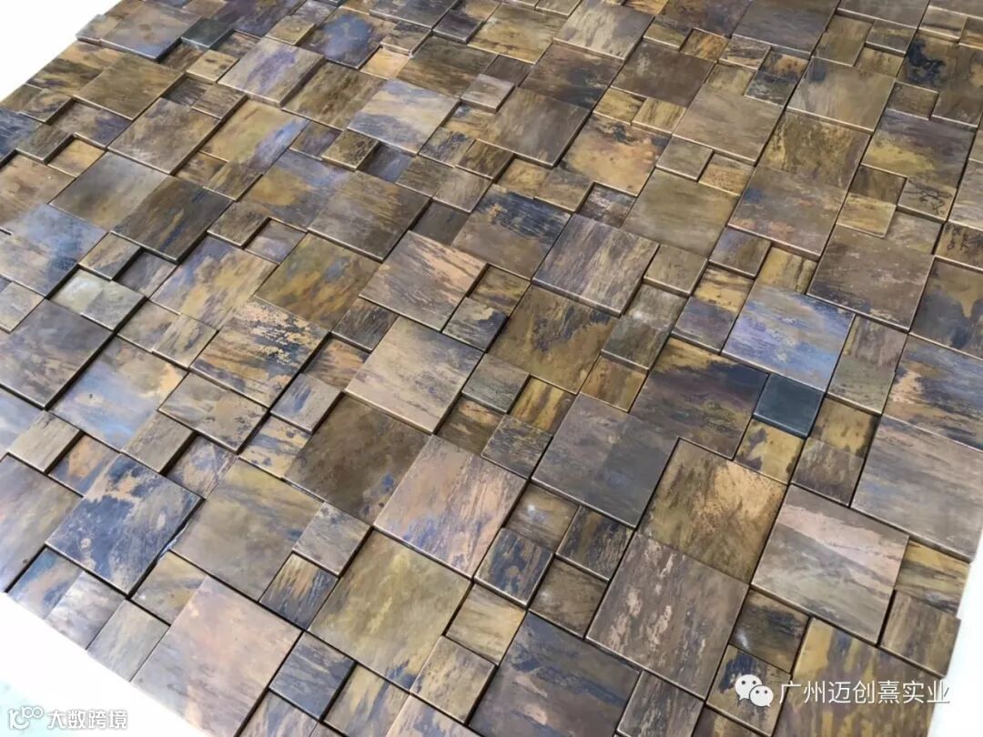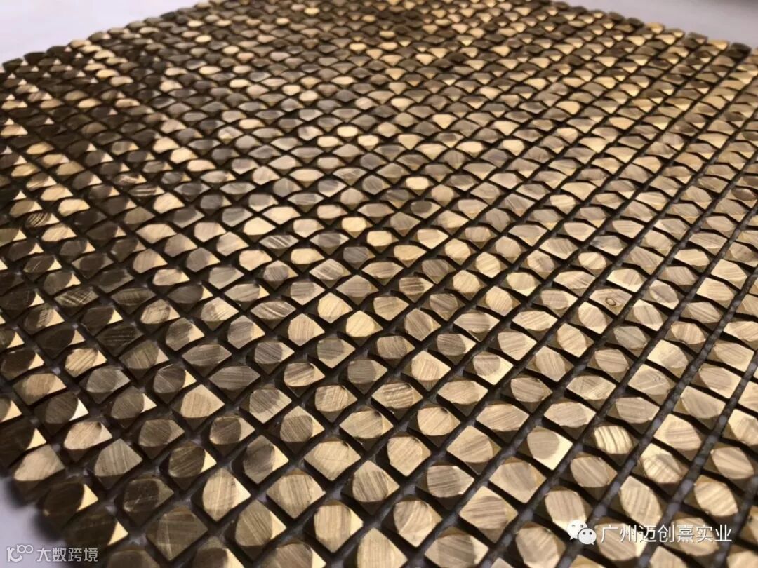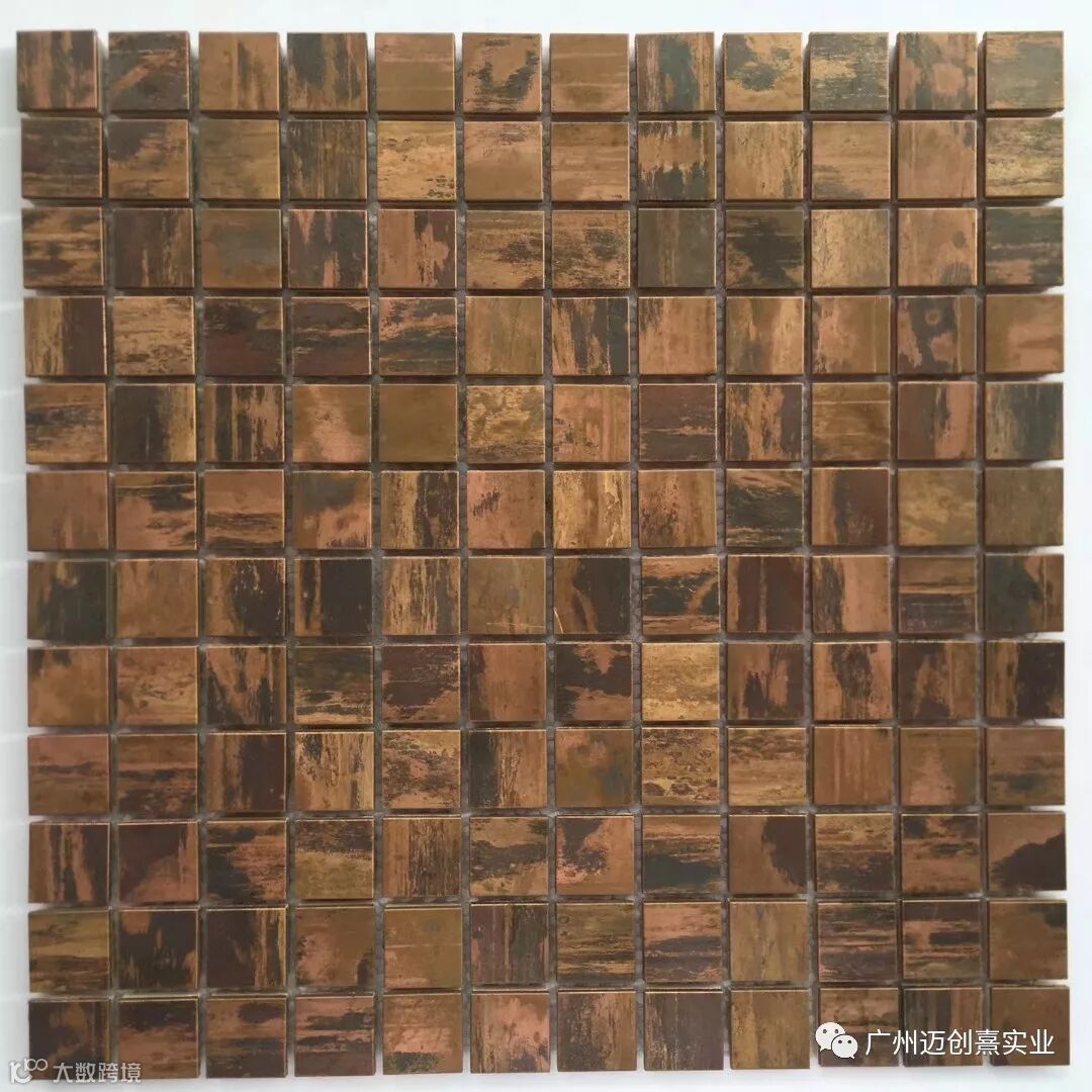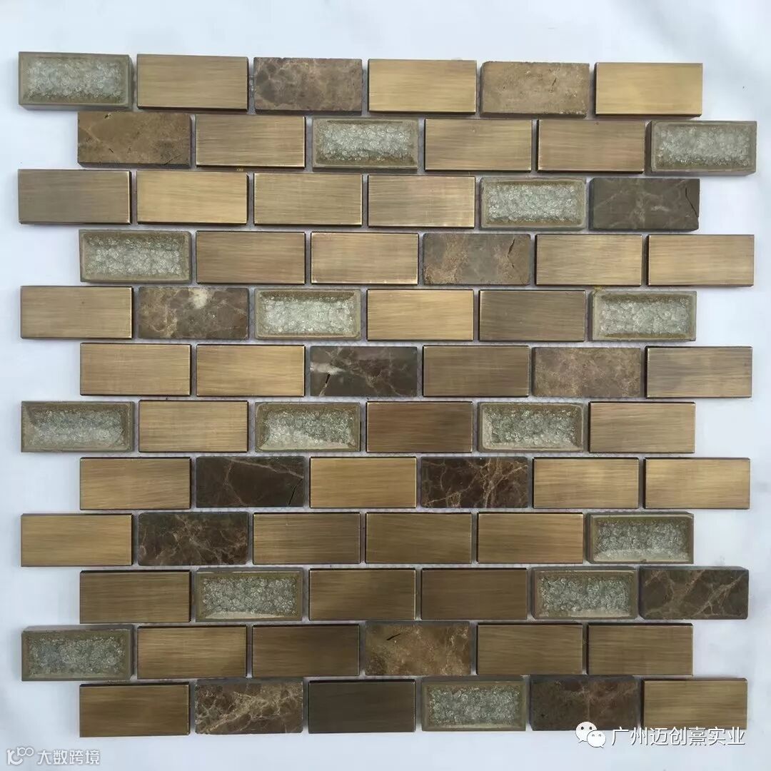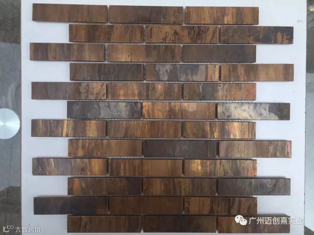 迈创熹实业重金属(铜或不锈钢)马赛克和砖片是指把冲压而成的一定厚度和形状的金属片,通过特殊的粘合剂覆合在全瓷砖片基体上,产品的基体是全瓷砖的特性- 高强度易施工, 而展现出的产品则是完全现代工业质感的腐蚀或抛光(铜或不锈钢)表面.