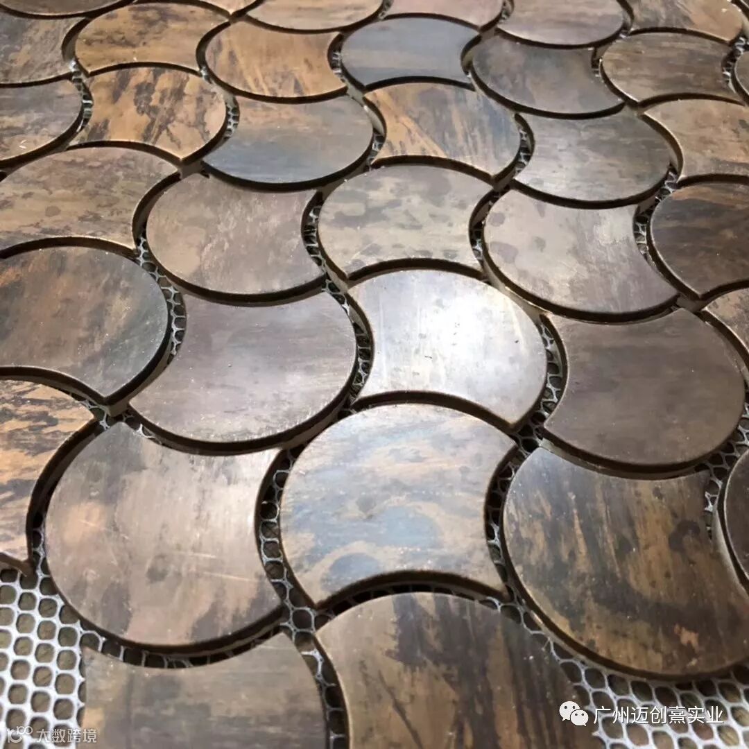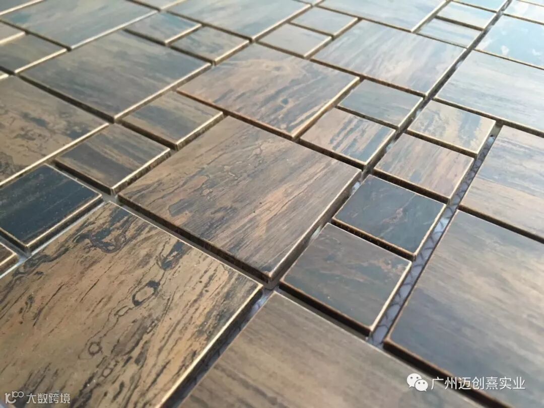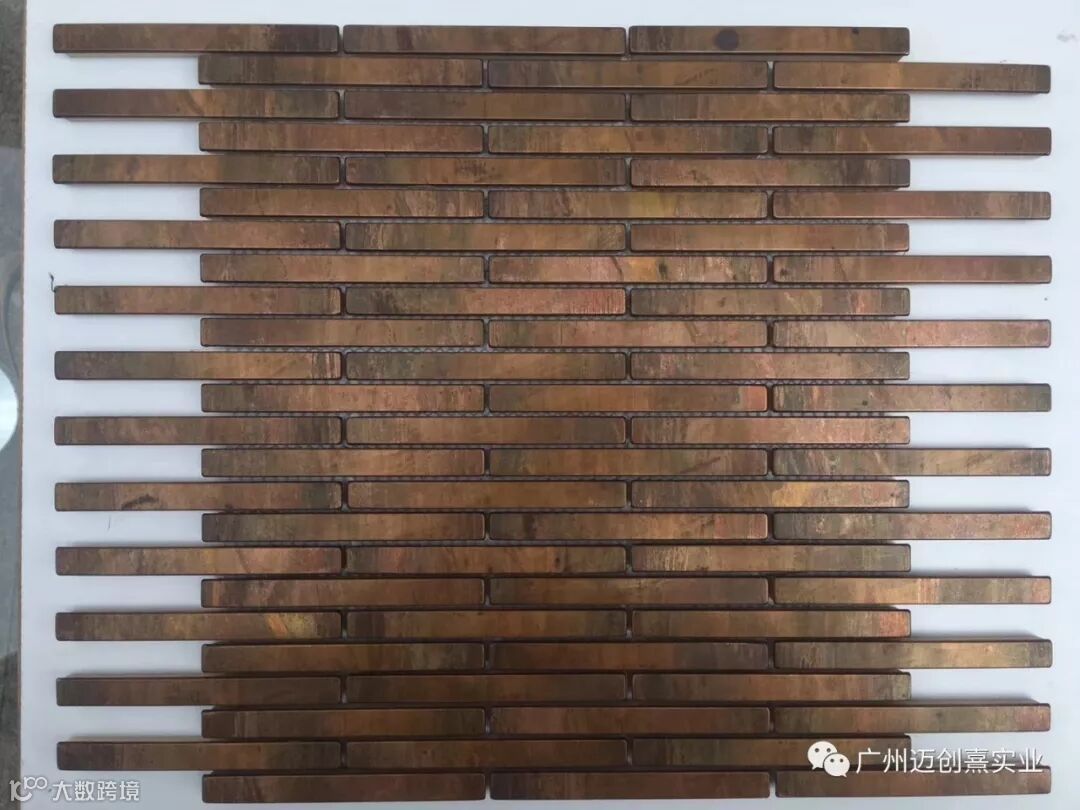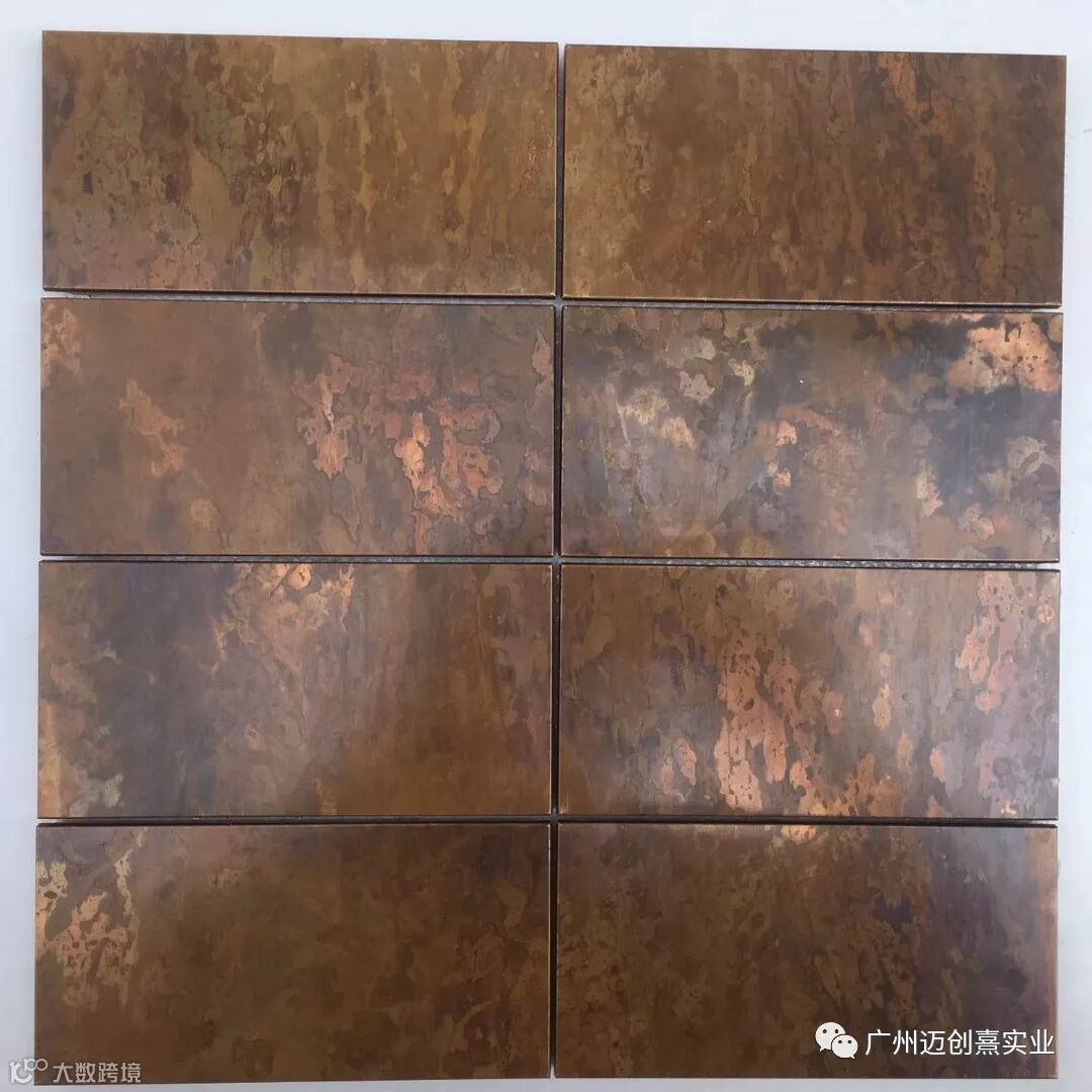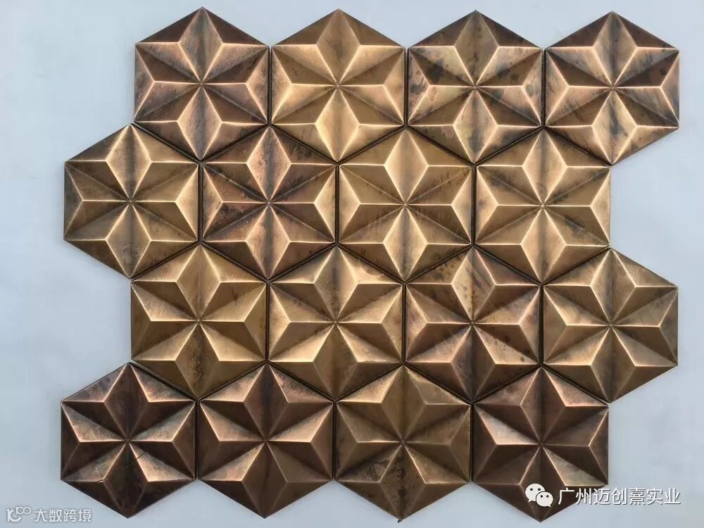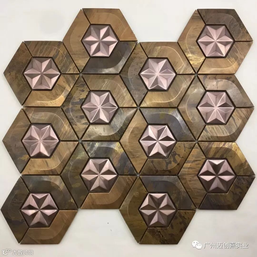 迈创熹实业重金属(铜或不锈钢)马赛克和砖片是指把冲压而成的一定厚度和形状的金属片,通过特殊的粘合剂覆合在全瓷砖片基体上,产品的基体是全瓷砖的特性- 高强度易施工, 而展现出的产品则是完全现代工业质感的腐蚀或抛光(铜或不锈钢)表面.