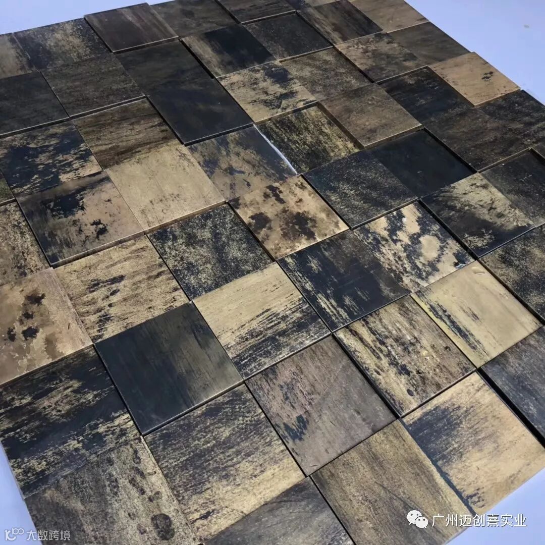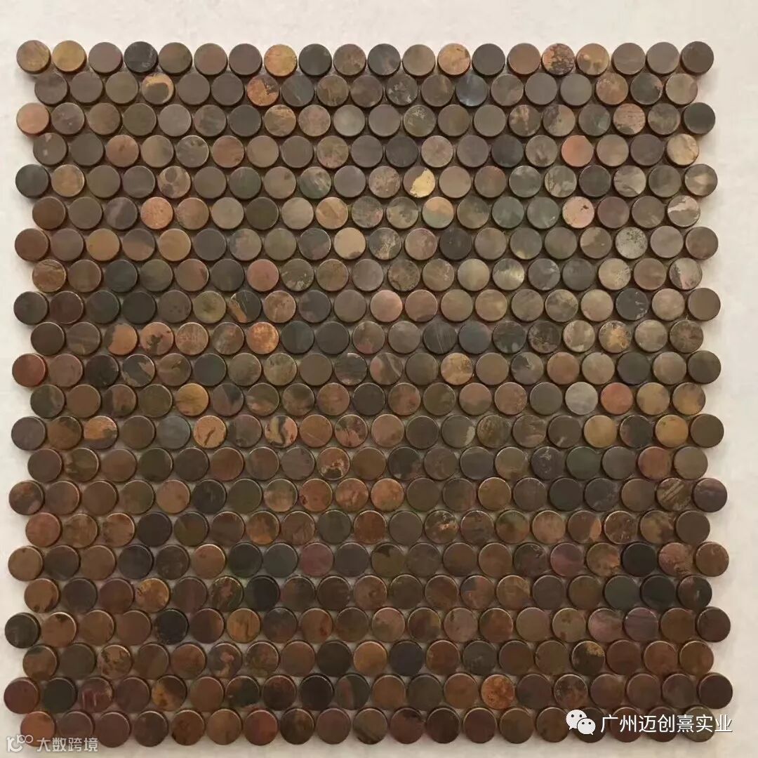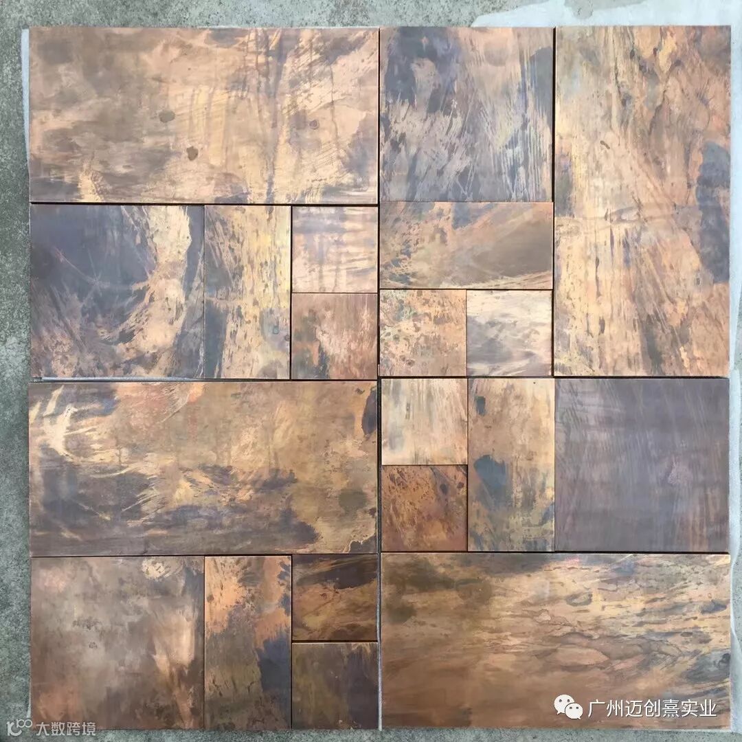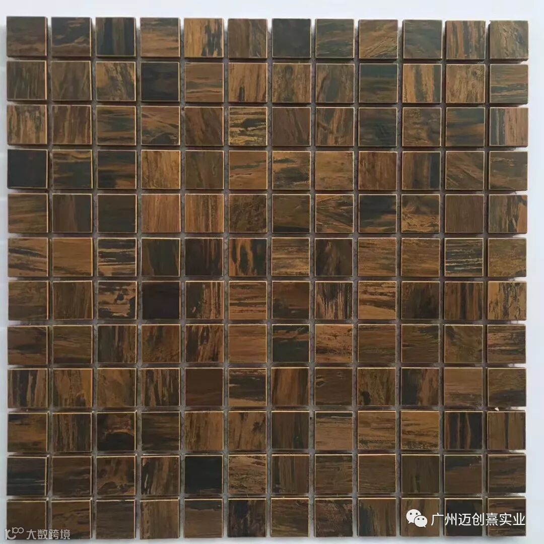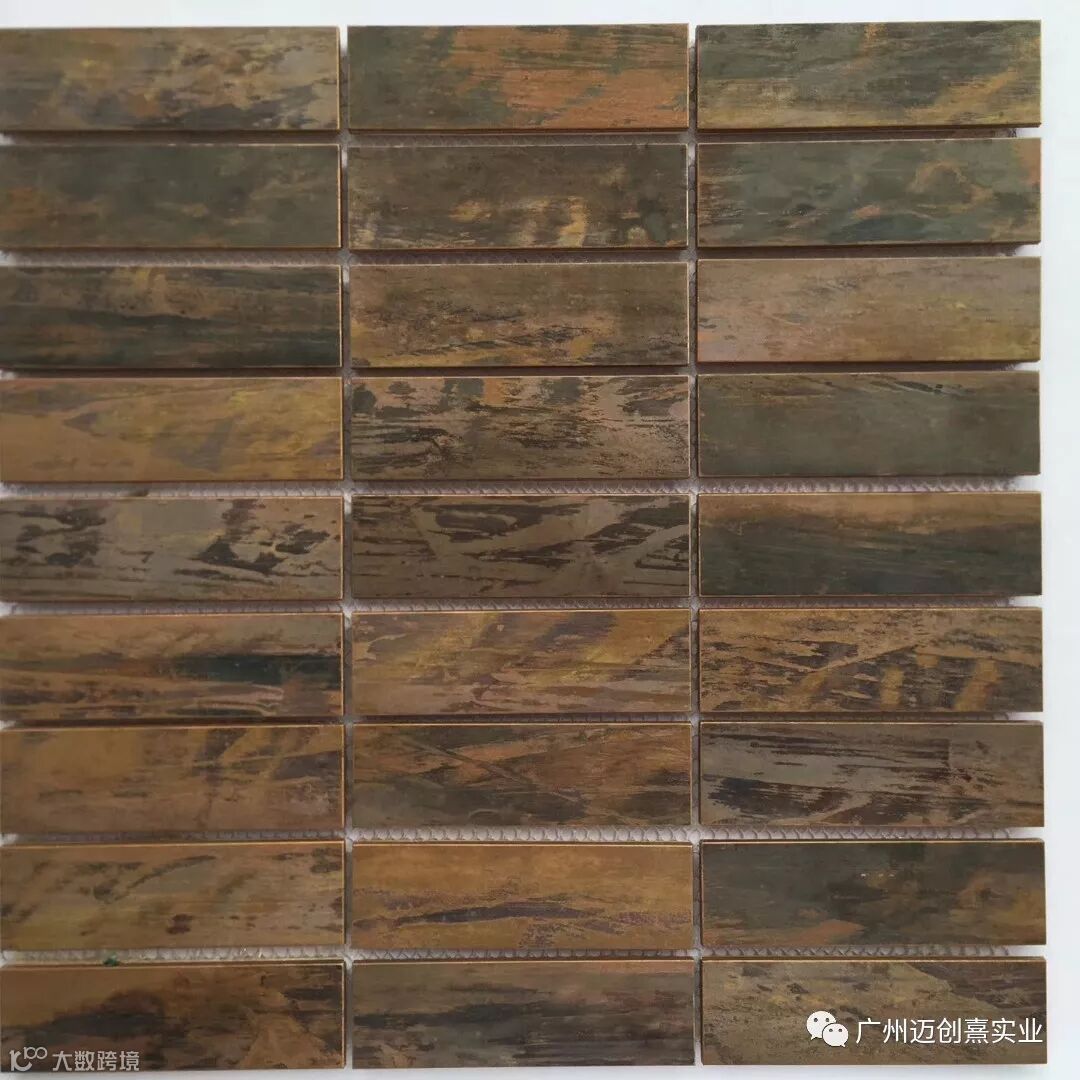迈创熹实业重金属(铜或不锈钢)马赛克和砖片是指把冲压而成的一定厚度和形状的金属片,通过特殊的粘合剂覆合在全瓷砖片基体上,产品的基体是全瓷砖的特性- 高强度易施工, 而展现出的产品则是完全现代工业质感的腐蚀或抛光(铜或不锈钢)表面.
