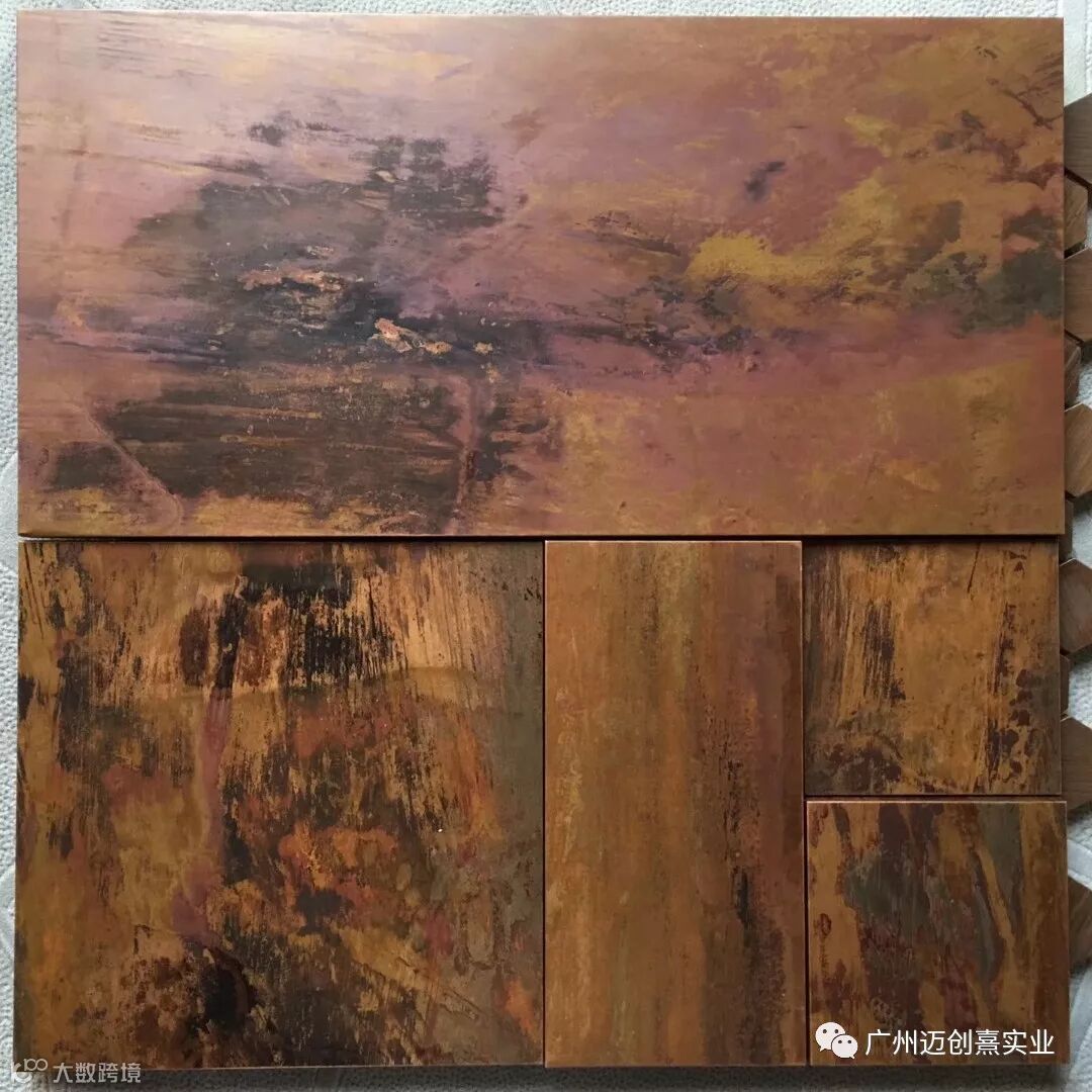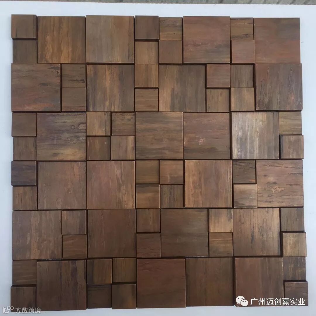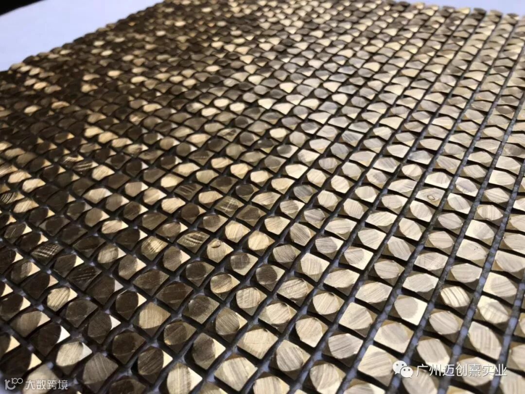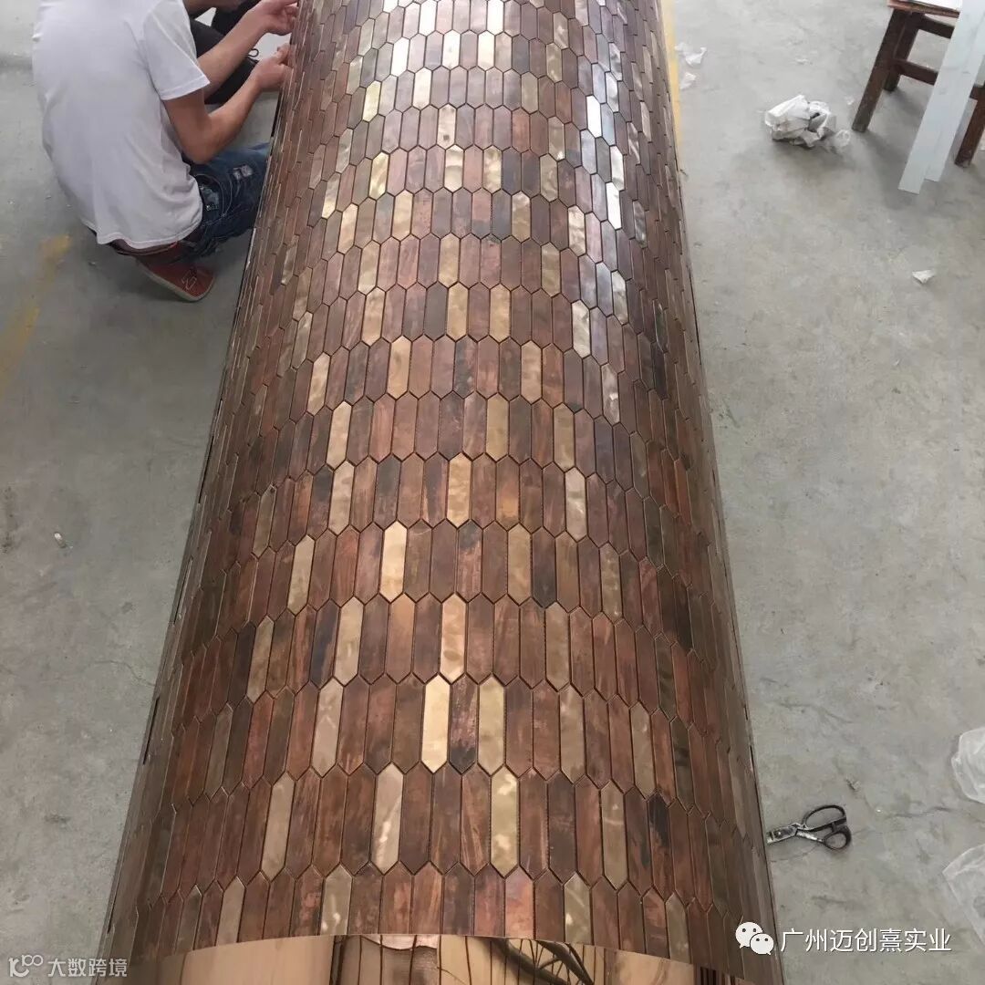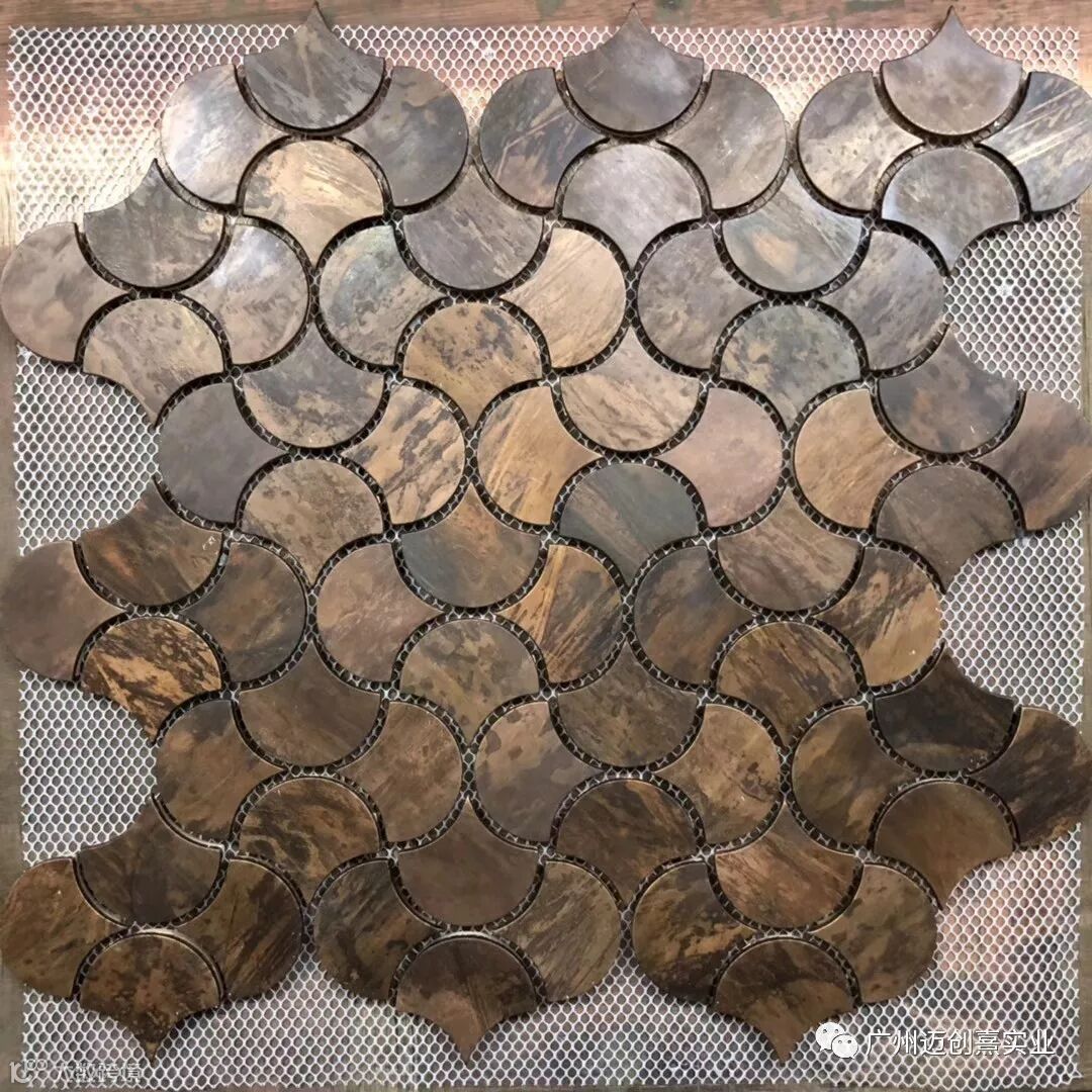 迈创熹实业重金属(铜或不锈钢)马赛克和砖片是指把冲压而成的一定厚度和形状的金属片,通过特殊的粘合剂覆合在全瓷砖片基体上,产品的基体是全瓷砖的特性- 高强度易施工, 而展现出的产品则是完全现代工业质感的腐蚀或抛光(铜或不锈钢)表面.