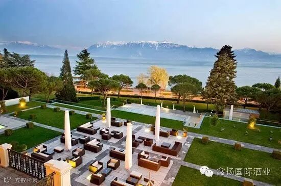 酒吧延伸到室外,由白色地毯分隔不同的区域。在这里可以看到日内瓦湖(Lake Geneva)的景色,不是有湖面上的清风拂面。冬季,室外的酒吧摆设将会被撤下来,转身成为滑冰场。