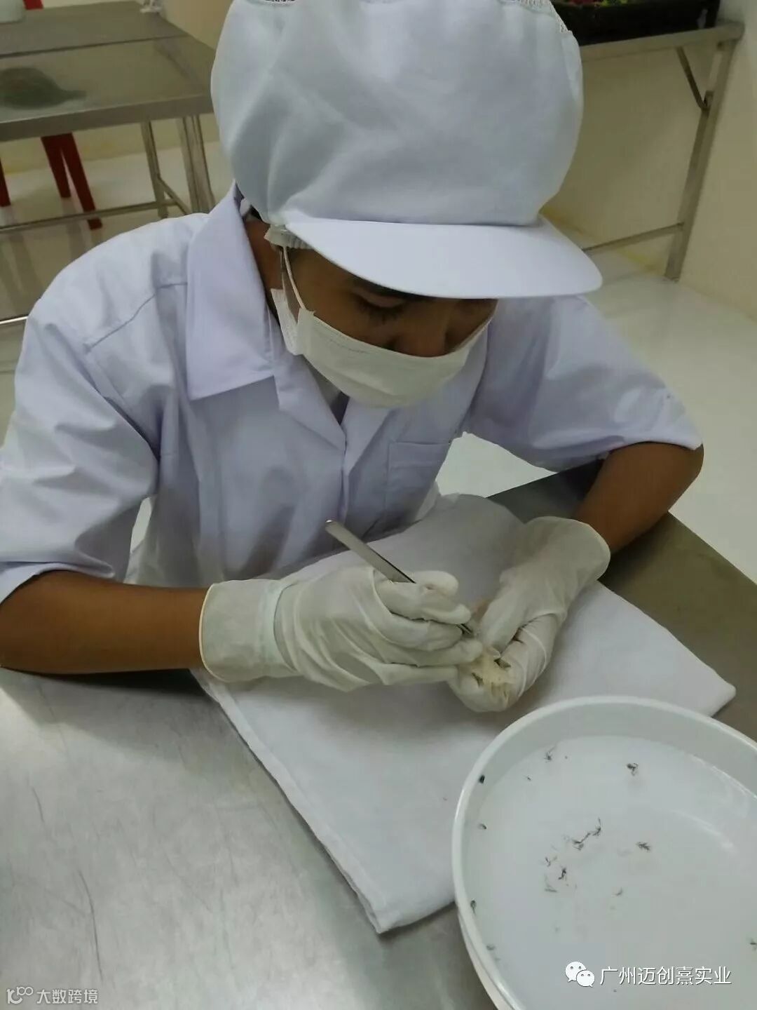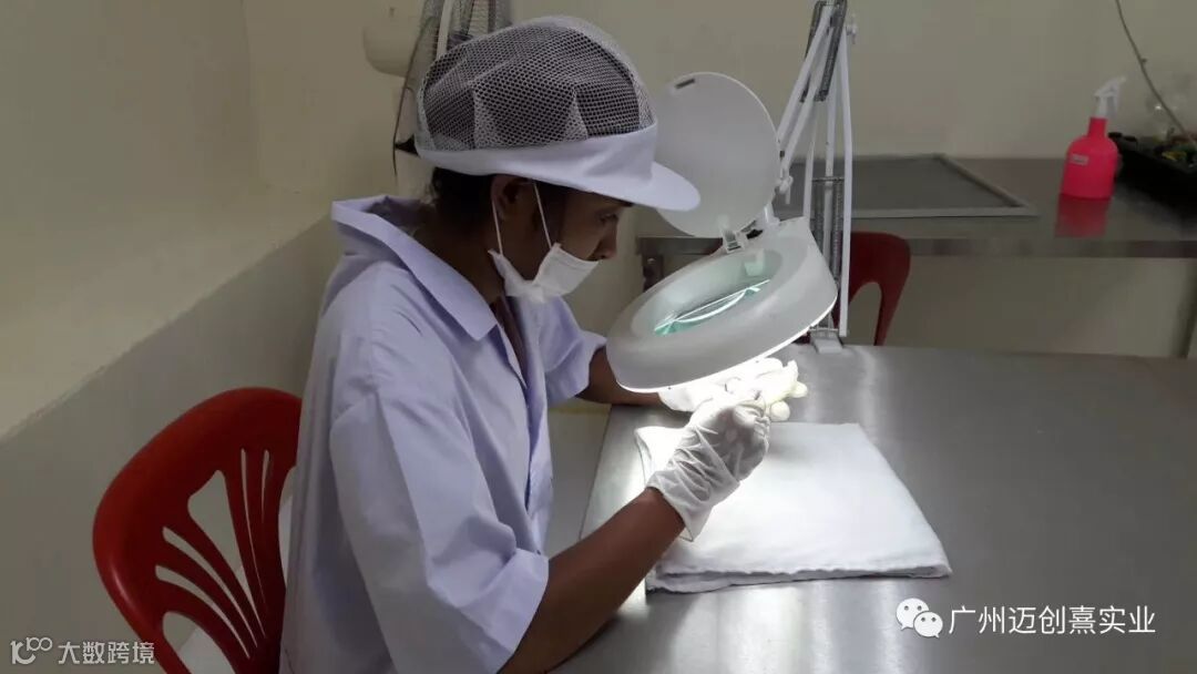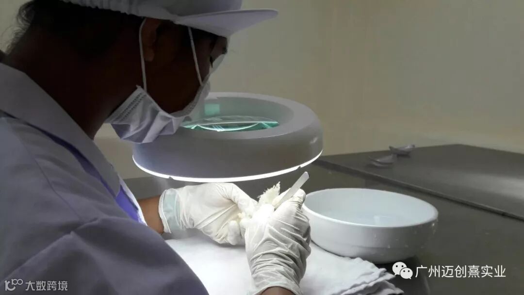 二挑:用镊子将肉眼可见的非燕窝杂物、及细毛、黑点去除干净。无法用镊子去除的黑点必须用镊子刮下来。