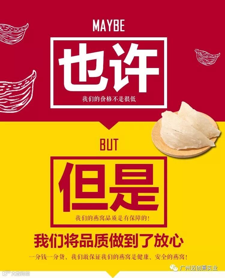 市场上燕窝质量参差不齐,价格有高有低,要买到好燕窝,首先要了解燕窝, “一分钱一分货”是亘古不变的道理。迈创熹出品的燕窝致力于给顾客销售好燕窝,宁愿为价格解释一阵子也不愿意为质量愧疚一辈子。 燕窝从原材料把关,精挑细选,挑出品质最好的,这样出来的燕窝效果也更好,因为我们深知回头客是我们的根本。各位朋友一定要记住:任何东西都是一分钱一分货,假如你花低价买到和我以上说的一样,请您一定要谨慎,可能是添加别的东西以次充好。千万不要抱有低价买高品质的心理。买燕窝是用来滋补调理身体的,千万别花了钱还对身体有害,那就得不偿失了。