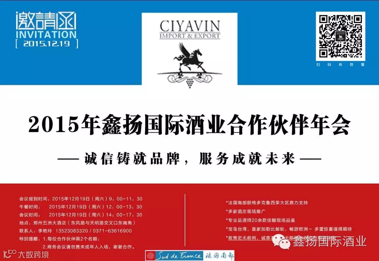 鑫扬国际酒业2015年年终诚意钜献,史无前例的会议规模,空前的利润释放,众多国外酒庄的鼎力支持,宝岛台湾,皇家加勒比邮轮,畅游欧洲...多重惊喜值得期待,诚邀您的光临!