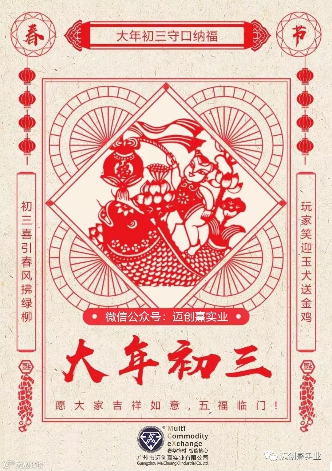 大年初三,问个好。福神到,喜气绕。财神罩,财源翘。家和谐,烦恼少。前程美,收入高。事业兴,仕途高。风雨顺,收成好。事如愿,乐逍遥。