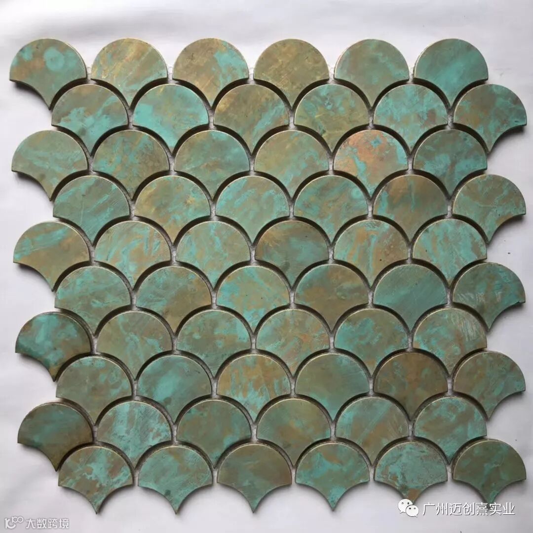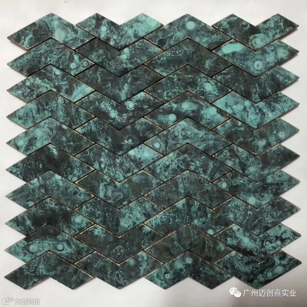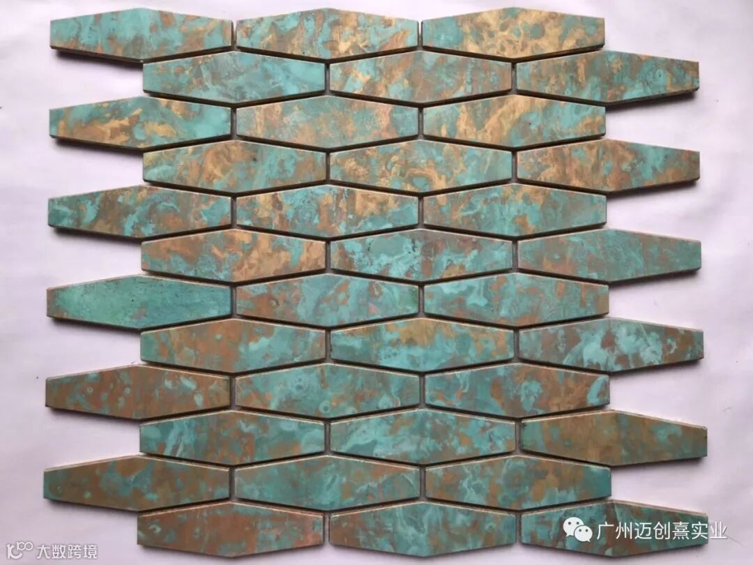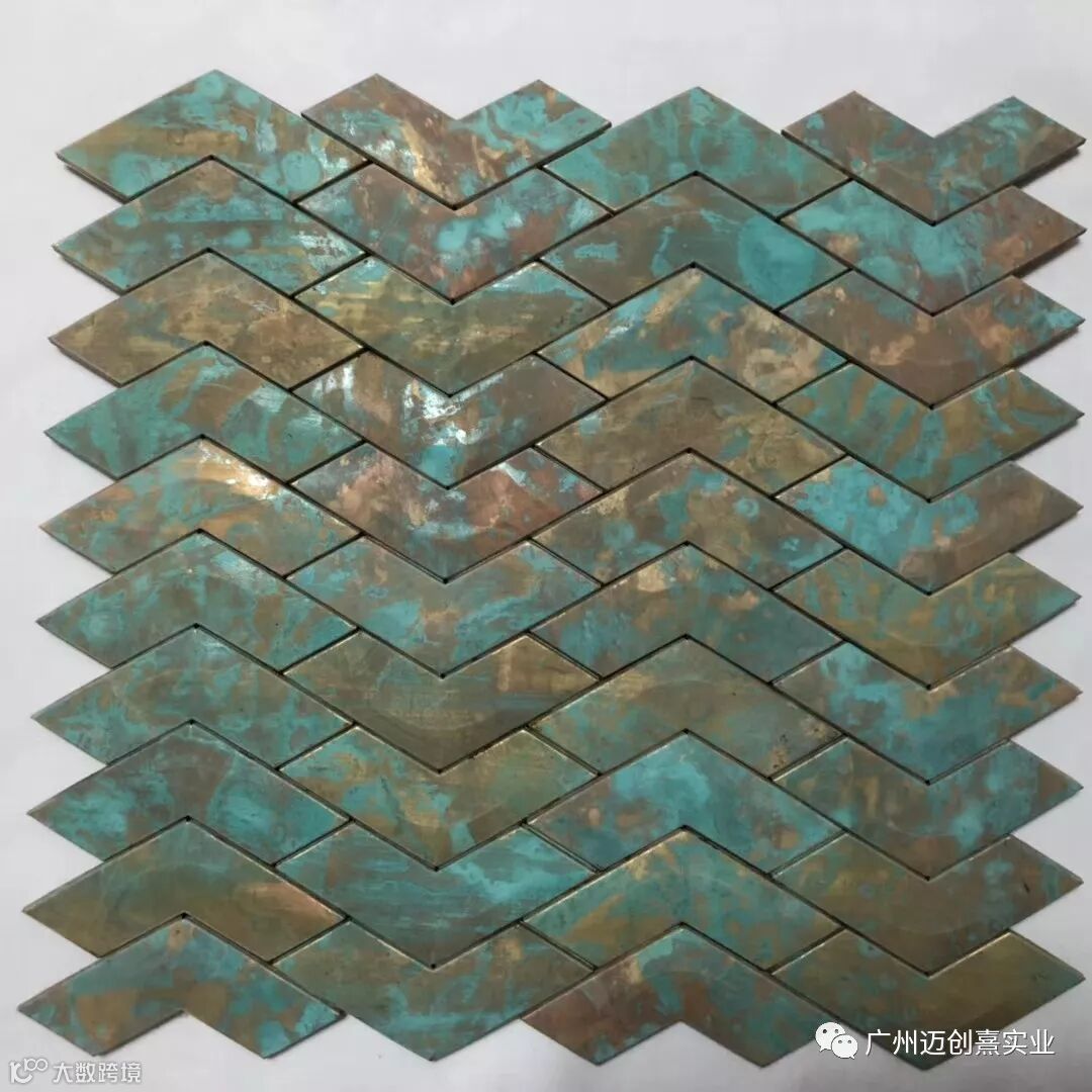 迈创熹实业重金属(铜或不锈钢)马赛克和砖片是指把冲压而成的一定厚度和形状的金属片,通过特殊的粘合剂覆合在全瓷砖片基体上,产品的基体是全瓷砖的特性- 高强度易施工, 而展现出的产品则是完全现代工业质感的腐蚀或抛光(铜或不锈钢)表面.