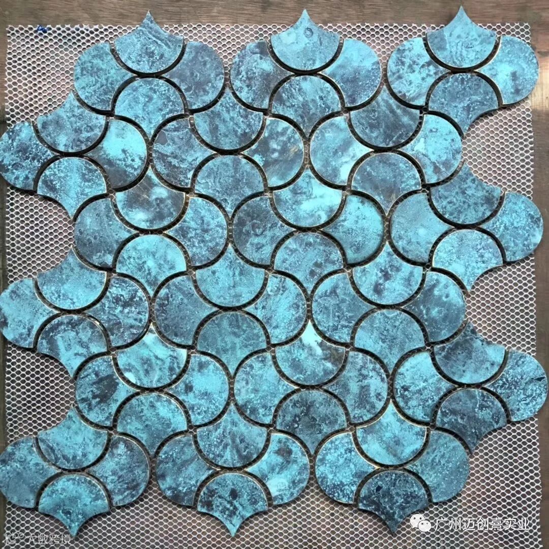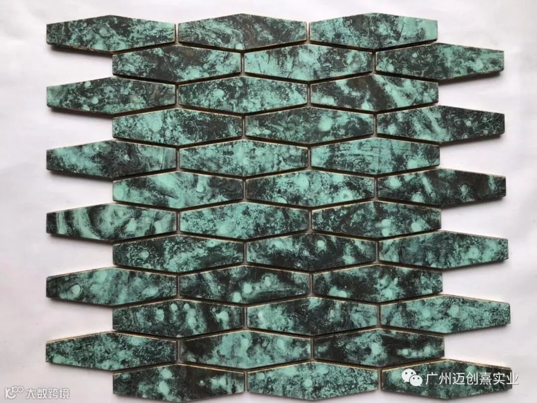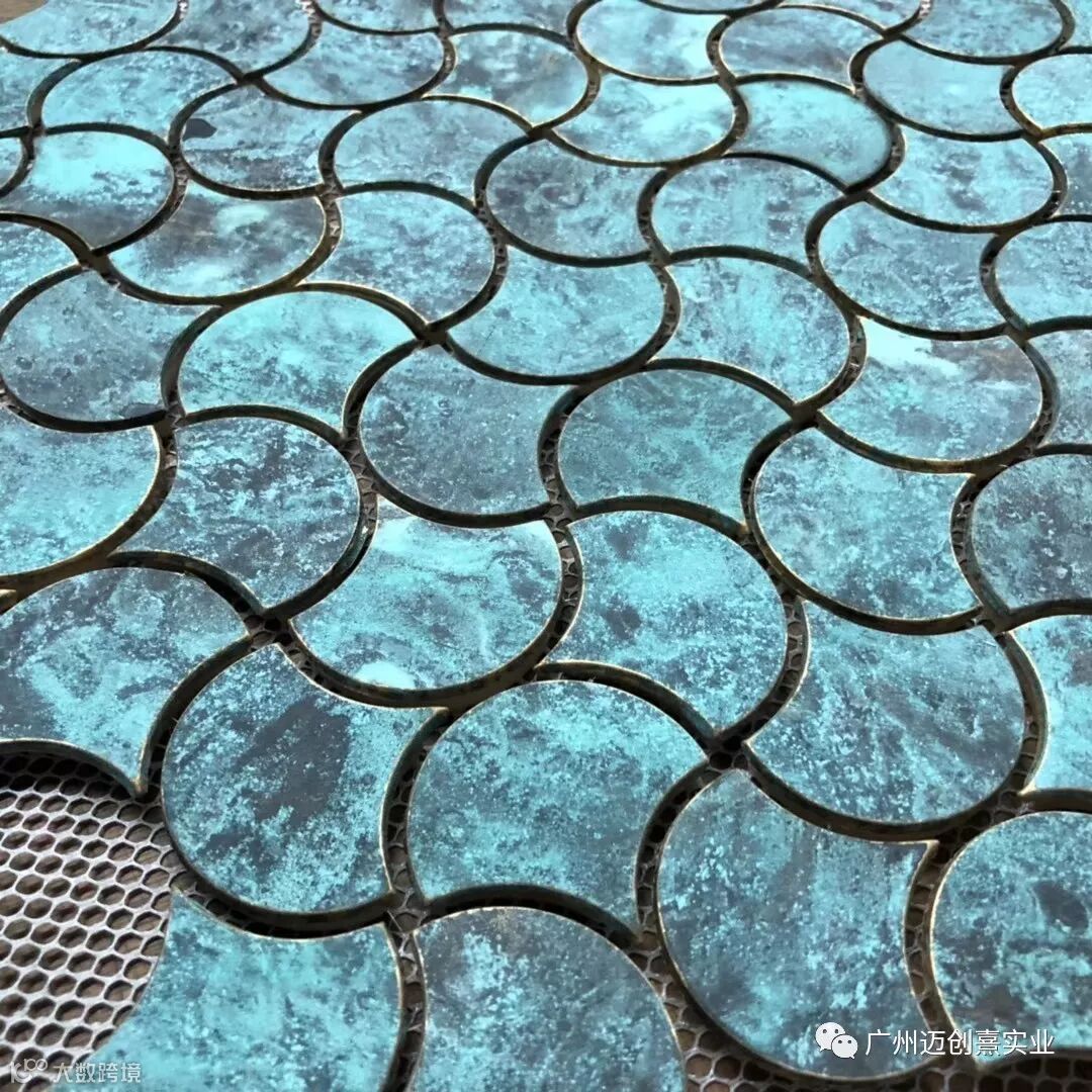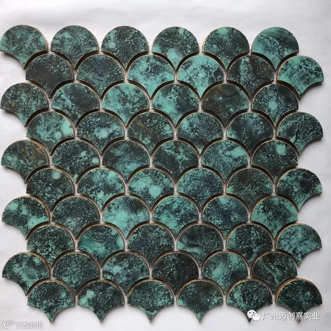 迈创熹实业重金属(铜或不锈钢)马赛克和砖片是指把冲压而成的一定厚度和形状的金属片,通过特殊的粘合剂覆合在全瓷砖片基体上,产品的基体是全瓷砖的特性- 高强度易施工, 而展现出的产品则是完全现代工业质感的腐蚀或抛光(铜或不锈钢)表面.