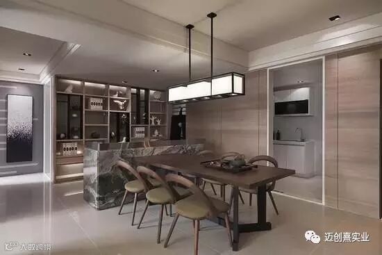 温润的木质餐桌冲淡了大理石吧台的冰冷感。
