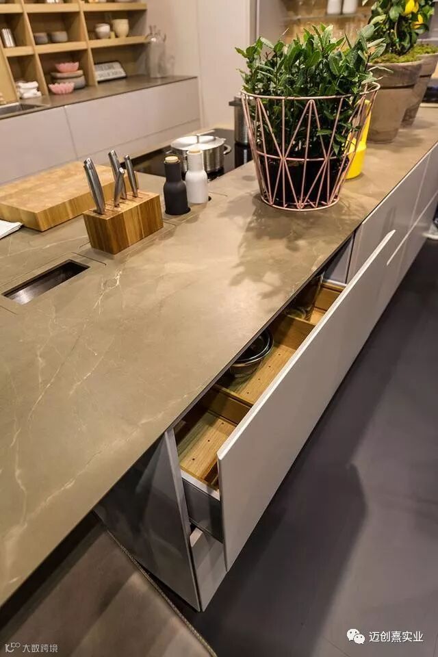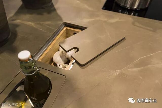 这里科普一下,这种材料是由天然石料和无机粘土经特殊工艺,采用最先进的真空挤压成型设备和全自动封闭式电脑控温辊道窑烧制1200度而成的一种新型陶瓷薄板。可以看到台面非常薄,仅有3mm,但是他的抗折强度和抗冲击力的性能却丝毫没有削弱。总的来说就是这东西啥都好,硬度高、不易脏,0甲醛,天然无污染,甚至可以直接在上面切菜,连砧板都不需要。