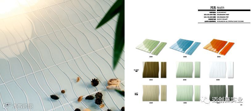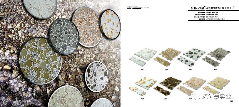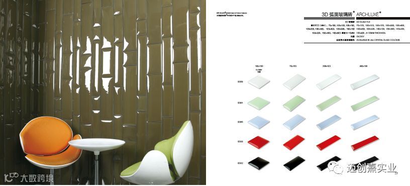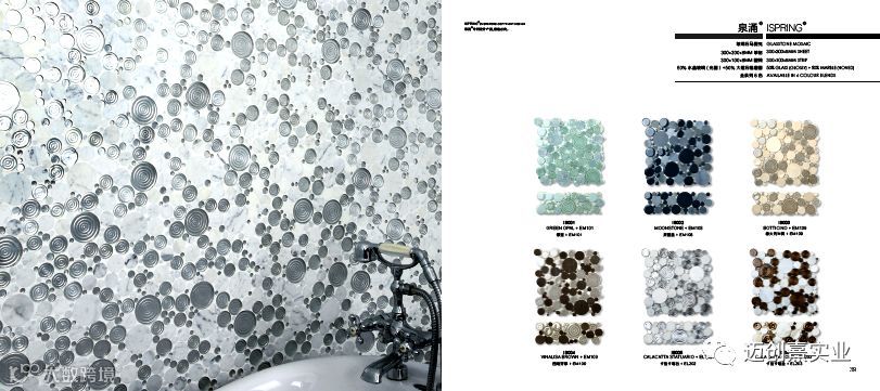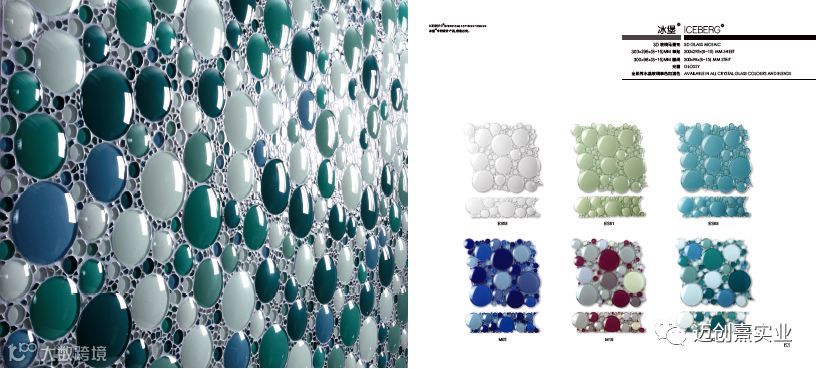2008 年EVERSTONE 在全球首次推出的3D 玻璃马赛克。2009 年九月该产品在代表全球最高水准的意大利博罗尼亚BOLOGNA 的世界卫浴博览会上首次亮相即引起轰动, 被当地传媒誉为“博览会最令人激动的创意产品”。经过4 年的研发,特殊的生产工艺使产品具有相当炫目的3D 弧形表面,色彩搭配热情奔放, 有多达69 个单体色彩和33 个混合色彩可以选择. 淡雅柔情者多选清淡单色如超