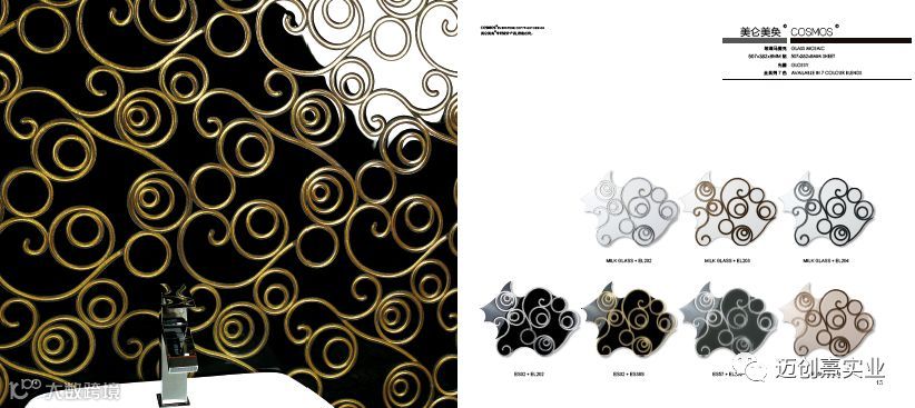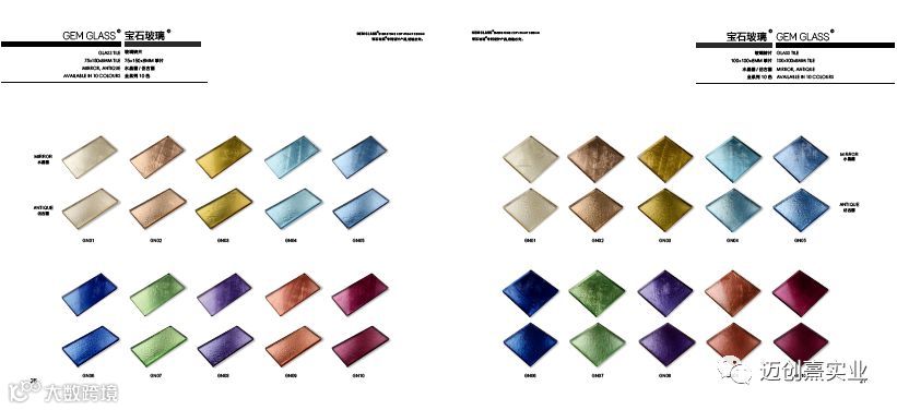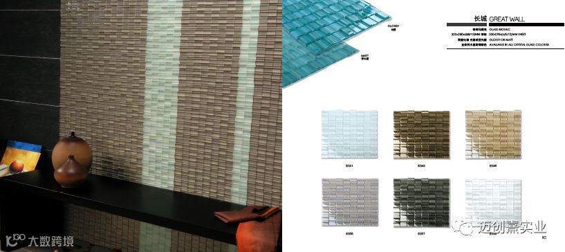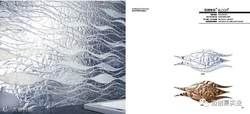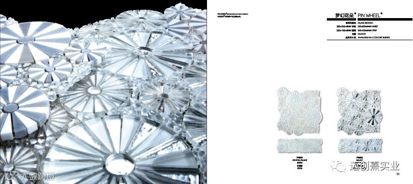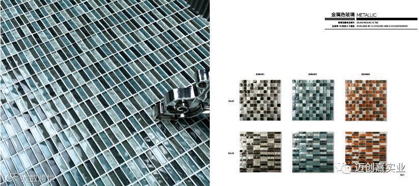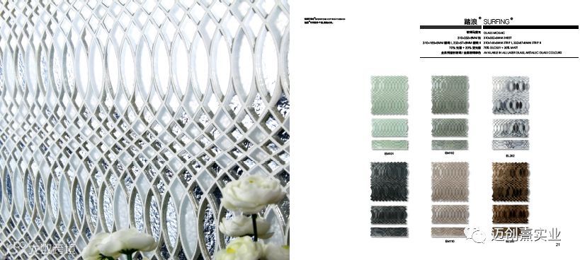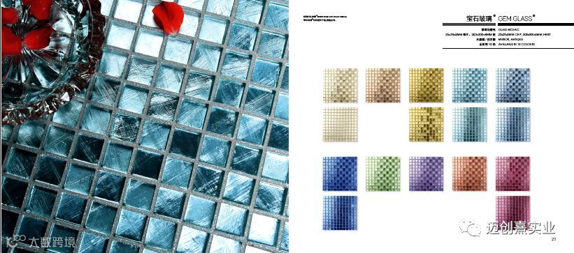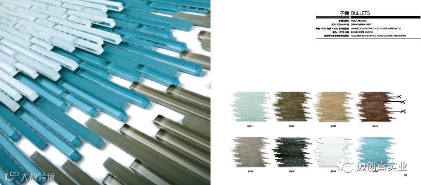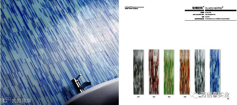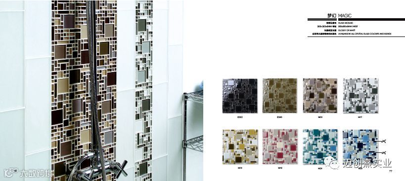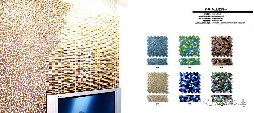 一个源于珠宝理念的设计产品。整个产品是由成千上万晶莹透亮的彩色玻璃小颗粒随机平铺在一起, 其制作工艺的复杂难度显而易见。不但颗粒细小, 而且每个颗粒的边缘都是象悬崖绝壁一样的陡直,更重要是在于工艺制作上俨然手工刺绣般的复杂过程, 所以可谓是不折不扣的手工艺品。因为来自每个颗粒不规则平面和直立面的多方位光反射, 使得每个颗粒呈现出珠宝般的光彩。该产品在美国和欧洲很受推崇,多数用在一些比较私人和个性的场所, 如卫生间的淋浴区,卧室某个灯光景观处, 高档会所的某些私密空间等,在一定灯光设计衬托下,更能营造出高贵而又典雅的情调和气氛. 这款产品配有专门的铺贴指导,使用者务必仔细阅读后方可安装产品.
