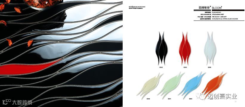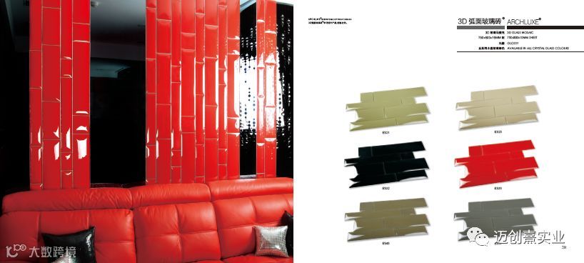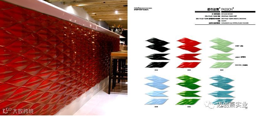 2010 年推出的另一款3D 产品, 创作思路是借性感红唇之造型来体现现代都市的情感诱惑和奔放热情,红色是最原始也是最经典的创作色彩. 横看是一片让人躁动的艳唇, 竖看是一片无辜坠落的红叶, 是这款产品的最直接的解读. 几乎是任意发挥的69 个色彩, 可以实现设计者心中无数个对性感、激情和幻想的终极创意。产品除了马赛克贴片外还特意设计了一款腰线, 可以很好的搭配在其它材料的使用上.横铺和立铺都会产生完全不同的装饰效果。