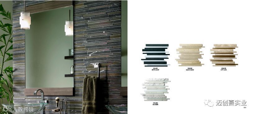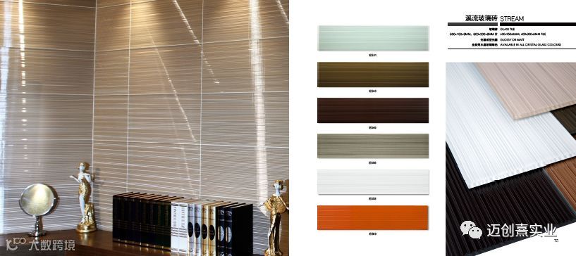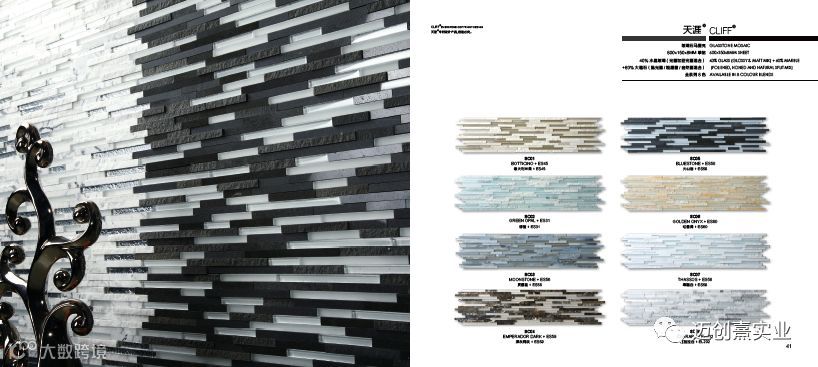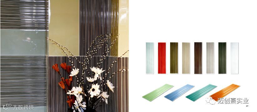 一款全新的极富流线动感的精致产品,2007 年首次推出。依托独特的加工工艺, 使细小颗粒的精美轮廓得以实现.这款产品有单色和混色两款颜色选择, 单色由70% 光面+30% 亚光组成, 整面铺贴效果具有极强流线动感和墙面立体感. 全光面的33 种混色组合, 同样使视觉上富有颜色和线条的多彩变换 . 产品的另一大特色是可以每贴裁成6 或3 窄条做腰线或装饰条来使用, 比较适合与其他大尺寸的装饰砖片搭配使用, 使墙面增强更多装饰效果。
